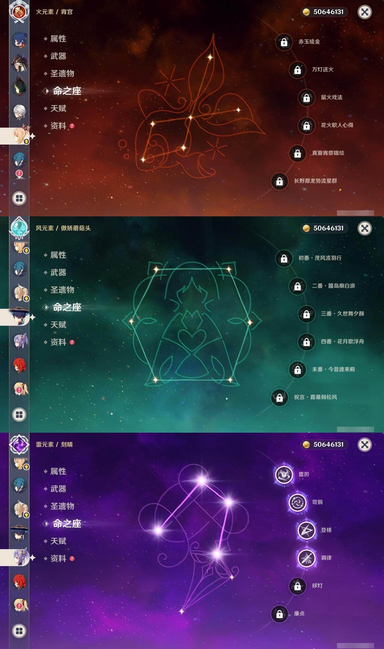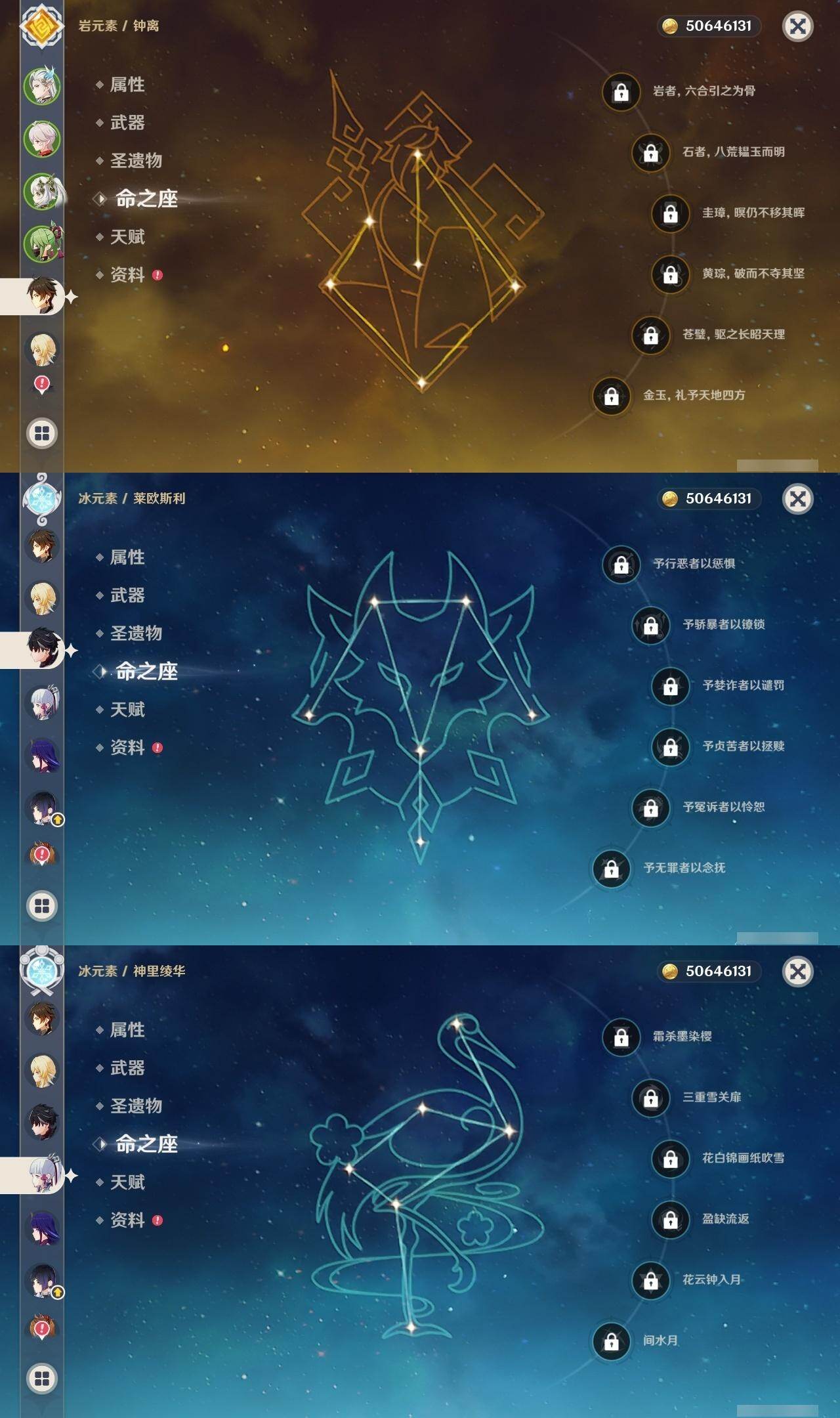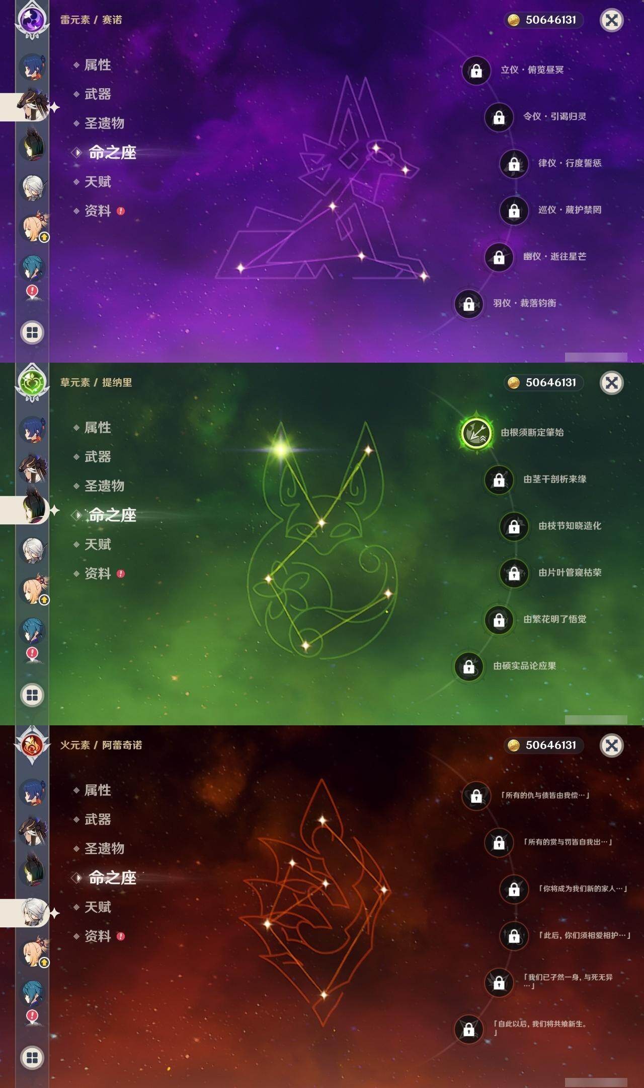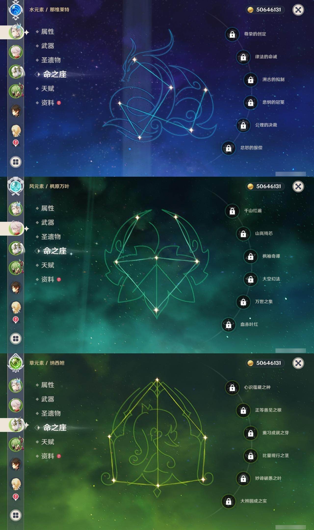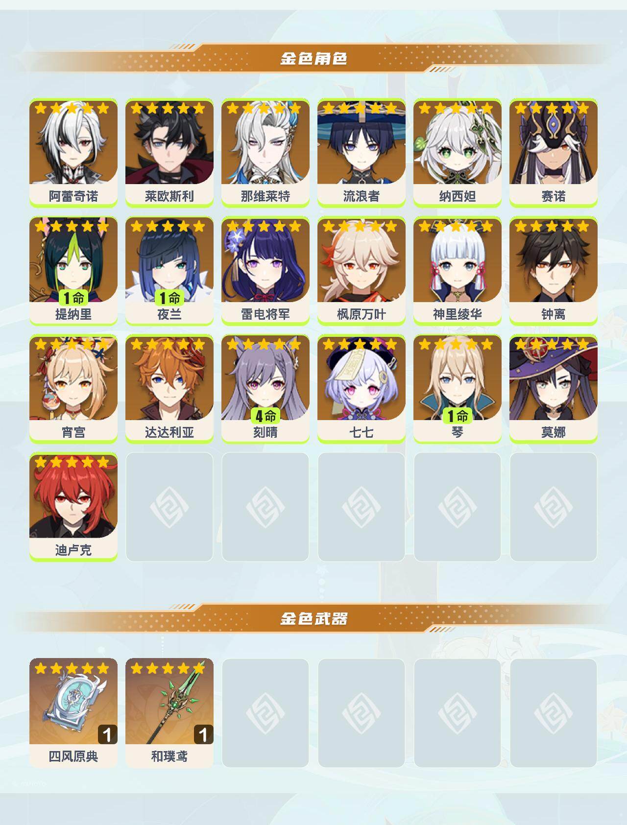 0命阿蕾奇诺,0命莱欧斯利,0命那维莱特,0命流浪者,0命纳西妲,0命赛诺,1命提纳里,1命夜兰,0命雷电将军,0命枫原万叶,0命神里绫华,0命钟离,0命宵宫,0命达达利亚,4命刻晴,0命七七,1命琴,0命莫娜,0命迪卢克,精1四风原典,精1和璞鸢
