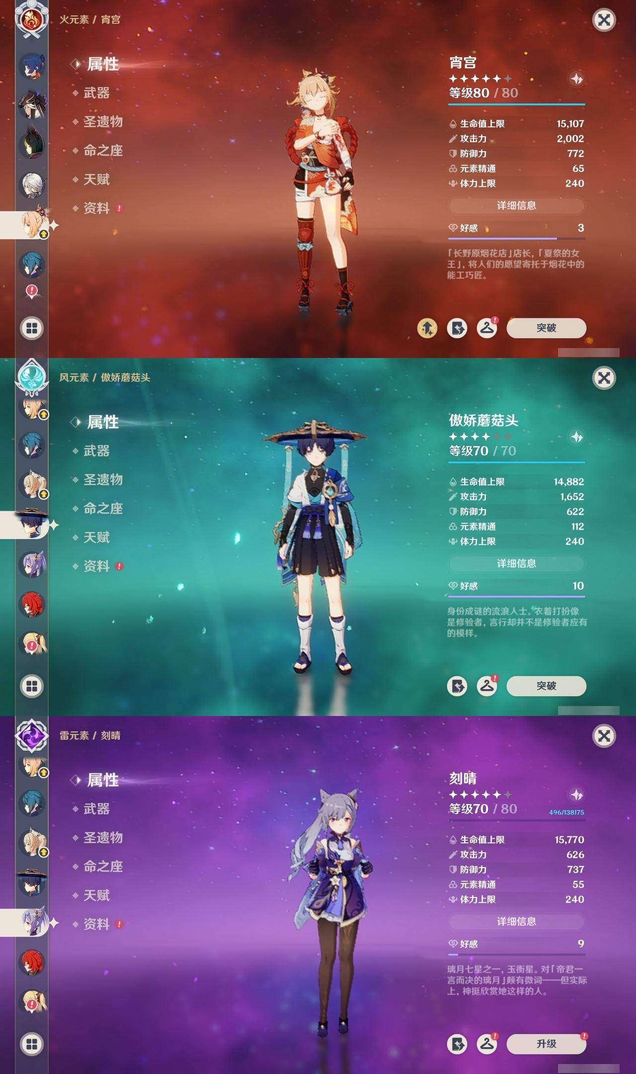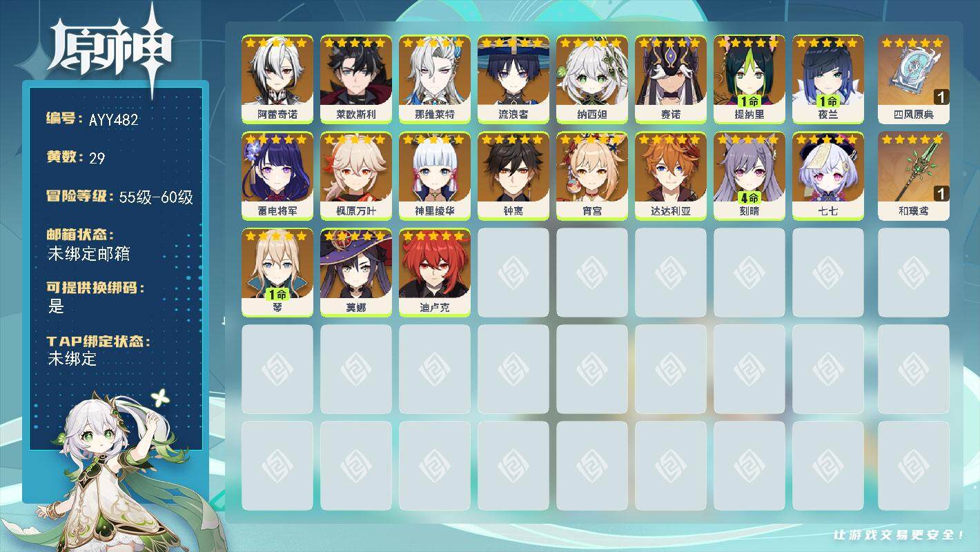 [16563074]59级/29黄/女主/19个五星角色/3个五星武器 0命阿蕾奇诺,0命莱欧斯利,0命那维莱特,0命流浪者,0命纳西妲,0命赛诺,1命提纳里,1命夜兰,0命雷电将军,0命枫原万叶,0命神里绫华,0命钟离,0命宵宫,0命达达利亚,4命刻晴,0命七七,1命琴,0命莫娜,0命迪卢克,精1四风原典,精1和璞鸢