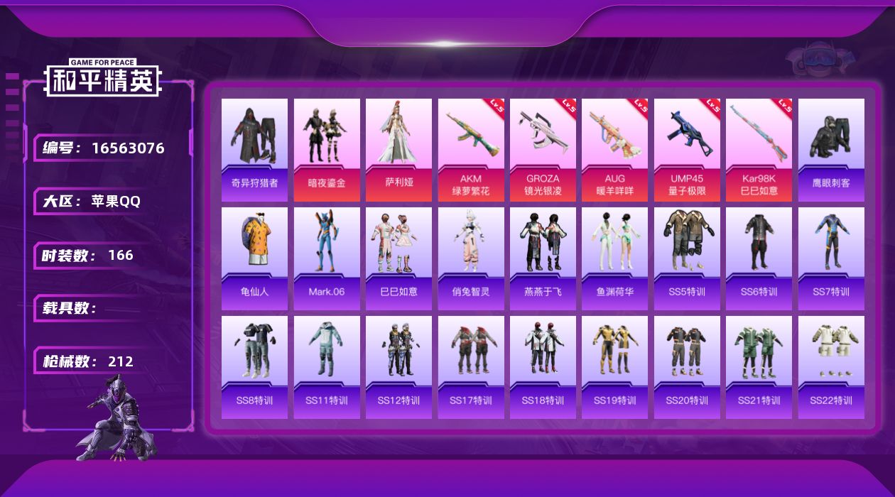 [16563076]苹果 手Q-2粉装-5特效枪-0载具-0粉色飞行器-56912热力值-10王牌印记-166套装-212枪皮 【热门品类】:套装-奇异狩猎者,套装-龟仙人,角色-Mark.06 【粉色套装】:粉装-暗夜鎏金,角色-萨利娅 【粉色枪皮等级】:AKM-绿萝繁花(五级),GROZA-镜光银凌(五级),AUG-暖羊咩咩(五级),UMP45-量子极限(五级),Kar98K-巳巳如意(五级) 【粉色枪皮】:AKM-绿萝繁花,GROZA-镜光银凌,AUG-暖羊咩咩,UMP45-量子极限,Kar98K-巳巳如意 【粉色降落伞】:极限特训降落伞,幻影战神降落伞,暗星紫秘降落伞,环太平洋降落伞,海螺星光降落伞,音爆索尼克降落伞,圣堂之誓降落伞,精灵梦叶罗丽降落伞,守护天翼降落伞,忍者神龟降落伞,临安公主降落伞,异瞳寒姬降落伞 【稀有套装】:套装-龟仙人,套装-巳巳如意,角色-俏兔智灵,套装-燕燕于飞,套装-鱼渊荷华 【稀有枪皮】:AKM-2P战斗服款,AKM-夜灯,AKM-彩虹符号,AKM-破晓战魂,AKM-萌趣颜团子,AKM-萝萝小趴兔,AKM-虎虎生威,AKM-霓虹街区,AKM-龙的传人,M16A4-幻世战舞者,M16A4-甜心亚梦,M16A4-红色方程式,M16A4-蓝色火焰,SCAR-L-夜灯,SCAR-L-玉兔迎春,SCAR-L-粉锦千层,SCAR-L-红色方程式,SCAR-L-黄金龙骨,M416-糯团青竹,M416-红色方程式,M416-绯红前夜,M416-蓝色火焰,GROZA-异彩先驱,GROZA-懵萌河马,GROZA-田园牧歌,GROZA-黑色刀锋,AUG-天降萌叽,AUG-拳皇97,AUG-耀粉歌者,QBZ-彩虹符号,M762-天降萌叽,M762-彩虹符号,M762-拳皇97,M762-暗夜鎏金,M762-牛气冲天,M762-瑞龙福将,M762-绯红前夜,M762-风花雪月,Mk47-妙红点点,G36C-懵萌河马,G36C-金风玉露,AC-VAL-天降萌叽,AC-VAL-快闪甜心,AC-VAL-甜心亚梦,蜜獾-天降萌叽,蜜獾-娇憨猪猪,UZI-天降萌叽,UZI-娇憨猪猪,UZI-炫彩节奏,UZI-红色方程式,UZI-金风玉露,UMP45-涂山之恋,UMP45-生命誓言,UMP45-蓝色火焰,Vector-生命誓言,Vector-田园牧歌,Vector-黑色刀锋,汤姆逊