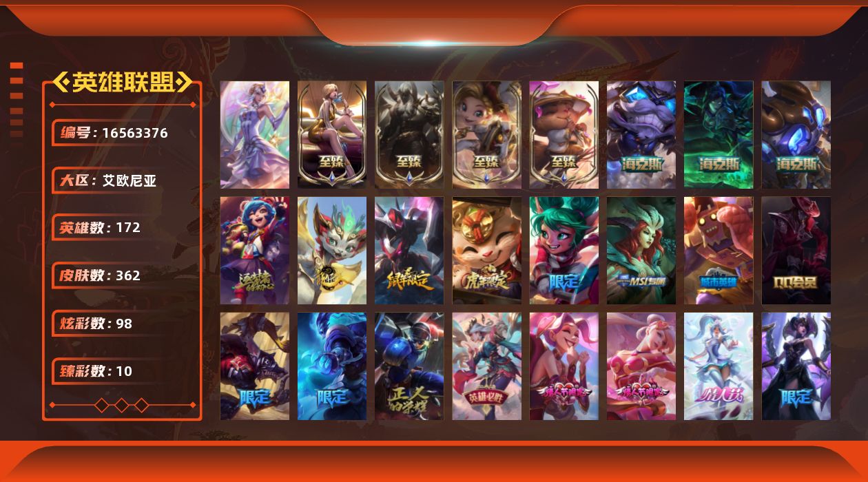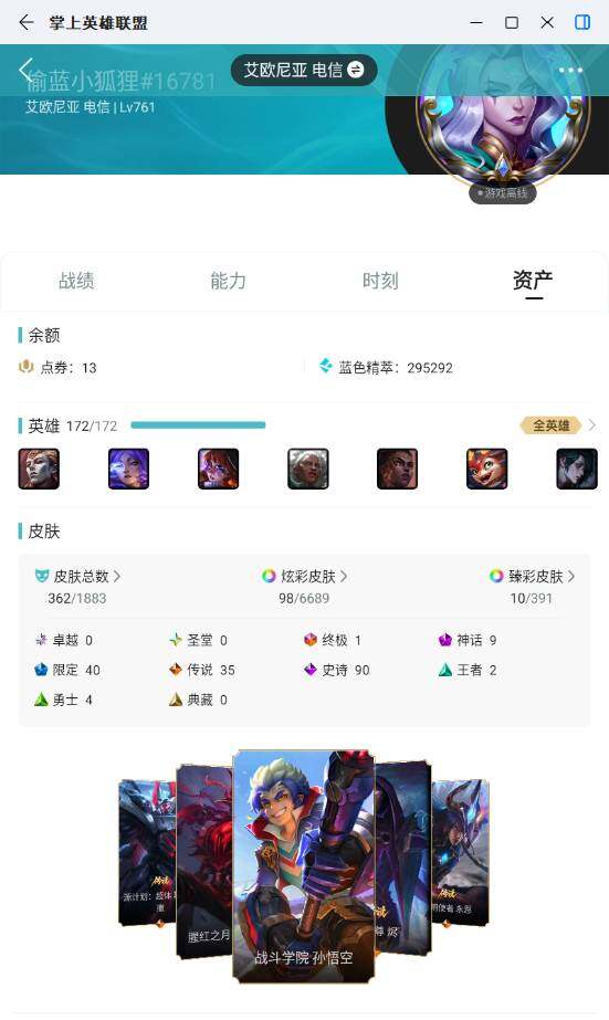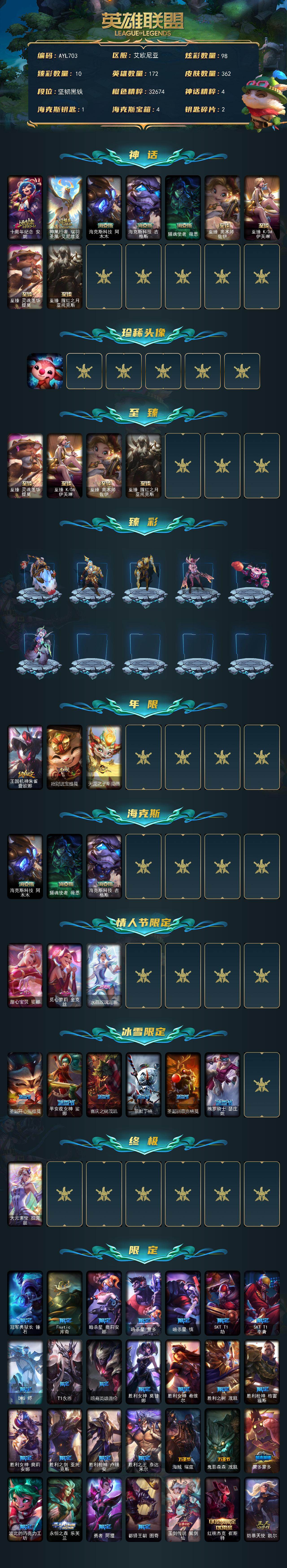 未定级段位-172英雄-362皮肤-98炫彩-1终极-9神话-40限定-35传说-90史诗