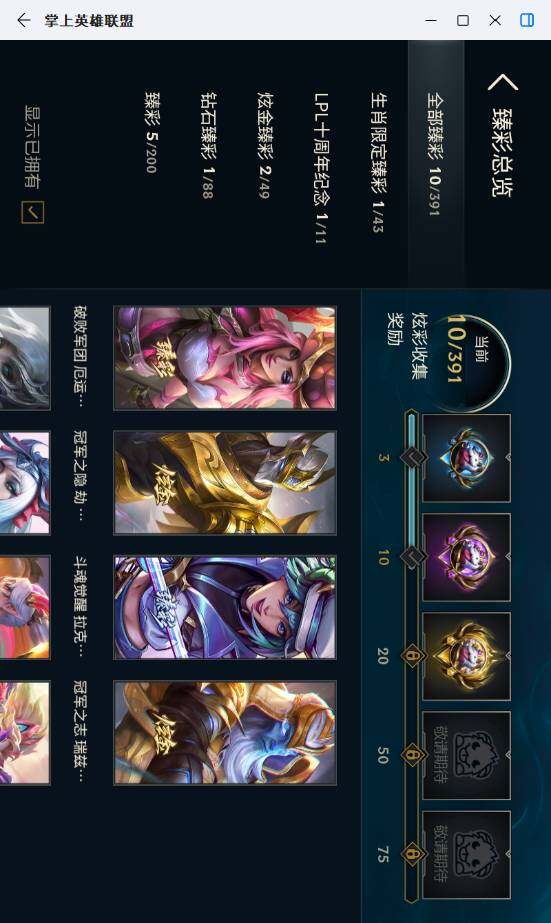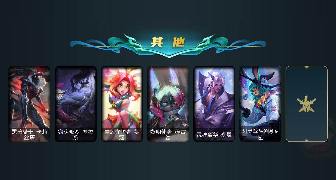 【臻彩皮肤】:天龙之子卡莎飞龙乘云,无畏骑士瑟庄妮赤子初心,冠军之志瑞兹凯旋圣装,冠军之隐劫凯旋圣装,斗魂觉醒拉克丝无限斗志,幻灵战斗蝠薇恩梦幻强袭,破败军团厄运小姐灵岛征伐使,可爱可爱粉红红布里茨,魔女阿卡丽虚荣,净雪之月莫甘娜冬虹