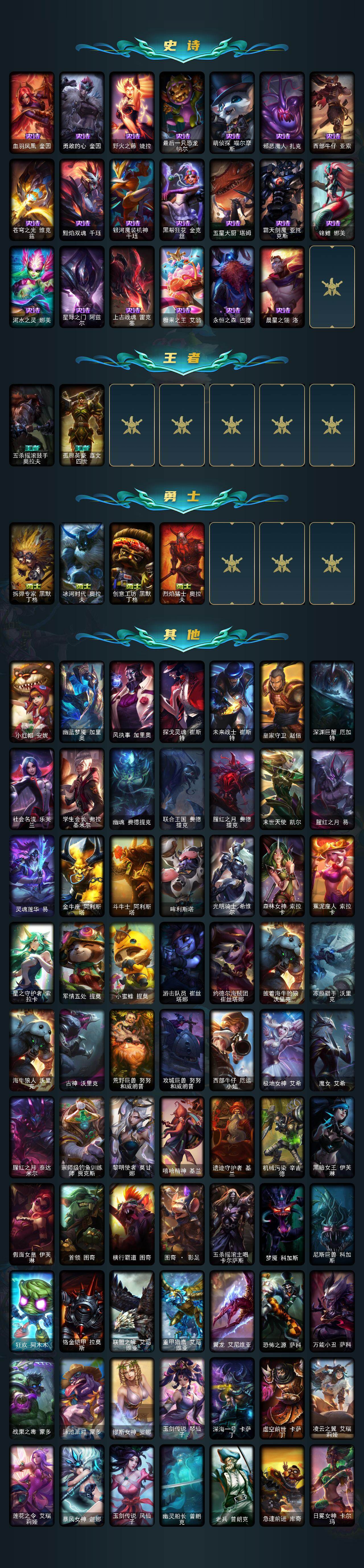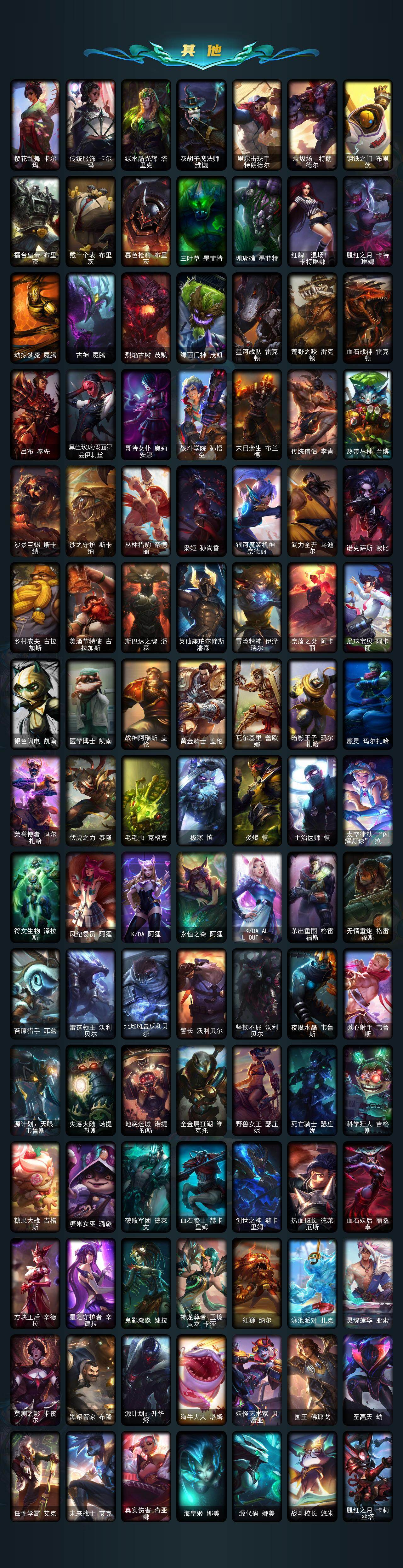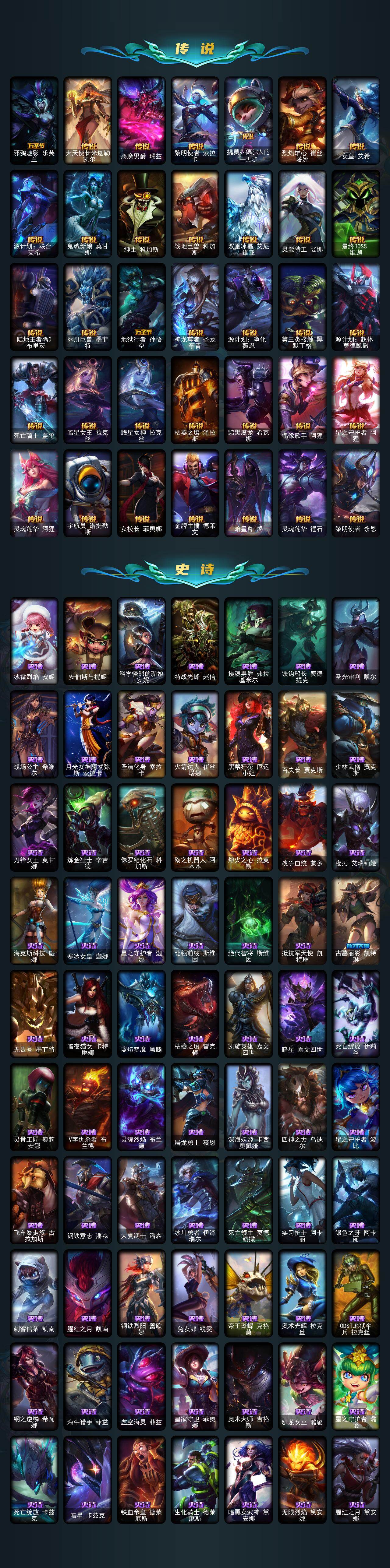 【传说皮肤】:邪鸦魅影乐芙兰,大天使长米迦勒凯尔,恶魔男爵瑞兹,黎明使者索拉卡,提莫约德尔人的一大步,烈焰雄心崔丝塔娜,女皇艾希,源计划联合艾希,鬼魂新娘莫甘娜,绅士科加斯,战地巨兽科加斯,双重冰晶艾尼维亚,灵能特工娑娜,最终BOSS维迦,陆地王者4WD布里茨,冰川巨兽墨菲特,地狱行者孙悟空,神龙尊者圣龙李青,源计划净化薇恩,第三类接触黑默丁格,源计划超体莫德凯撒,死亡骑士盖伦,暗星女王拉克丝,耀星女神拉克丝,枯萎之壤泽拉斯,黯黑魔龙希瓦娜,偶像歌手阿狸,星之守护者阿狸,灵魂莲华阿狸,宇航员诺提勒斯,女校长菲奥娜,金牌主播德莱文,暗星尊烬,灵魂莲华锤石,黎明使者永恩