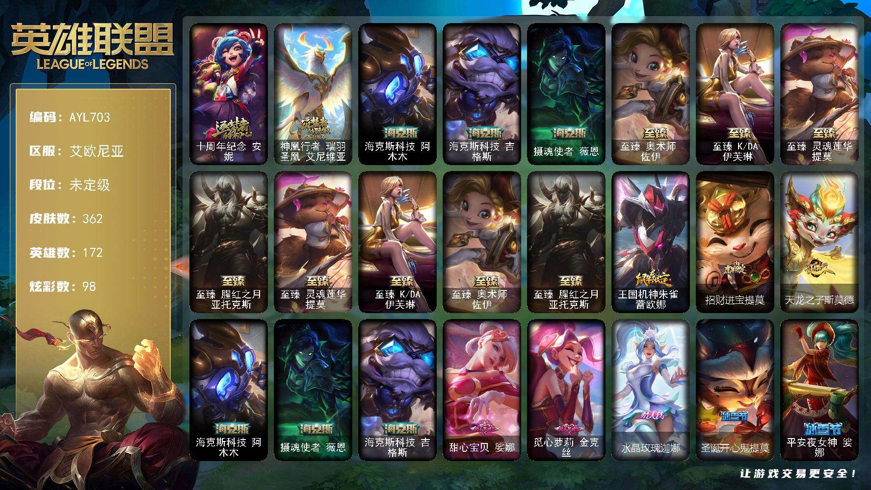 [16563376]【特价出售/店主推荐】 未定级段位-172英雄-362皮肤-98炫彩-1终极-9神话-40限定-35传说-90史诗 【神话皮肤】:十周年纪念安妮,神凰行者瑞羽圣凰艾尼维亚,海克斯科技阿木木,海克斯科技吉格斯,摄魂使者薇恩,至臻奥术师佐伊,至臻KDA伊芙琳,至臻灵魂莲华提莫,至臻腥红之月亚托克斯 【珍稀头像】:至爱的鹿头像 【至臻皮肤】:至臻灵魂莲华提莫,至臻KDA伊芙琳,至臻奥术师佐伊,至臻腥红之月亚托克斯 【臻彩皮肤】:天龙之子卡莎飞龙乘云,无畏骑士瑟庄妮赤子初心,冠军之志瑞兹凯旋圣装,冠军之隐劫凯旋圣装,斗魂觉醒拉克丝无限斗志,幻灵战斗蝠薇恩梦幻强袭,破败军团厄运小姐灵岛征伐使,可爱可爱粉红红布里茨,魔女阿卡丽虚荣,净雪之月莫甘娜冬虹 【年限皮肤】:王国机神朱雀蕾欧娜,招财进宝提莫,天龙之子斯莫德 【海克斯皮肤】:海克斯科技阿木木,摄魂使者薇恩,海克斯科技吉格斯 【情人节限定】:甜心宝贝娑娜,觅心萝莉金克丝,水晶玫瑰迦娜 【冰雪限定】:圣诞开心鬼提莫,平安夜女神娑娜,喜庆之树茂凯,雪默丁格,圣诞驯鹿克格莫,魄罗骑士瑟庄妮 【终极皮肤】:大元素使拉克丝 【限定皮肤】:冠军典狱长锤石,Fnatic库奇,暗杀星奥莉安娜,暗杀星蒙多,暗杀星慎,SKTT1劫,SKTT1李青,DWG烬,T1永恩,暗裔英雄盖伦,胜利女神莫甘娜,胜利女神希维尔,胜利之树茂凯,胜利枪神格雷福斯,胜利女神奥莉安娜,胜利之剑亚托克斯,胜利枪神卢锡安,胜利之王泰达米尔,海贼瑞兹,鬼影森森茂凯,蒙多蒙多,波比的巧克力工坊,永恒之森乐芙兰,勇者阿狸,都铎王朝图奇,玉剑传说翼剑仙,红桃杰克崔斯特,防暴天使凯尔 【传说皮肤】:邪鸦魅影乐芙兰,大天使长米迦勒凯尔,恶魔男爵瑞兹,黎明使者索拉卡,提莫约德尔人的一大步,烈焰雄心崔丝塔娜,女皇艾希,源计划联合艾希,鬼魂新娘莫甘娜,绅士科加斯,战地巨兽科加斯,双重冰晶艾尼维亚,灵能特工娑娜,最终BOSS维迦,陆地王者4WD布里茨,冰川巨兽墨菲特,地狱行者孙悟空,神龙尊者圣龙李青,源计划净化薇恩,第三类接触黑默丁格,源计划超体莫德凯撒,死亡骑士盖伦,暗星女王拉克丝,耀星女神拉克丝,枯萎之壤泽拉斯,黯黑魔龙希瓦娜,偶像歌手阿狸,星之守护者阿狸,灵魂莲华阿狸,宇航员诺提勒斯,女校长菲奥娜,金牌主播德莱文,暗星尊烬,灵魂莲华锤石,黎明使者永恩 【史诗皮肤】:冰霜烈焰安妮,安伯