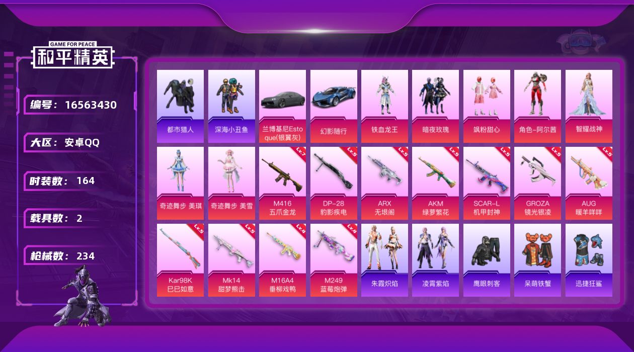 [16563430]安卓 手Q-7粉装-11特效枪-2载具-1粉色飞行器-75713热力值-10王牌印记-164套装-234枪皮