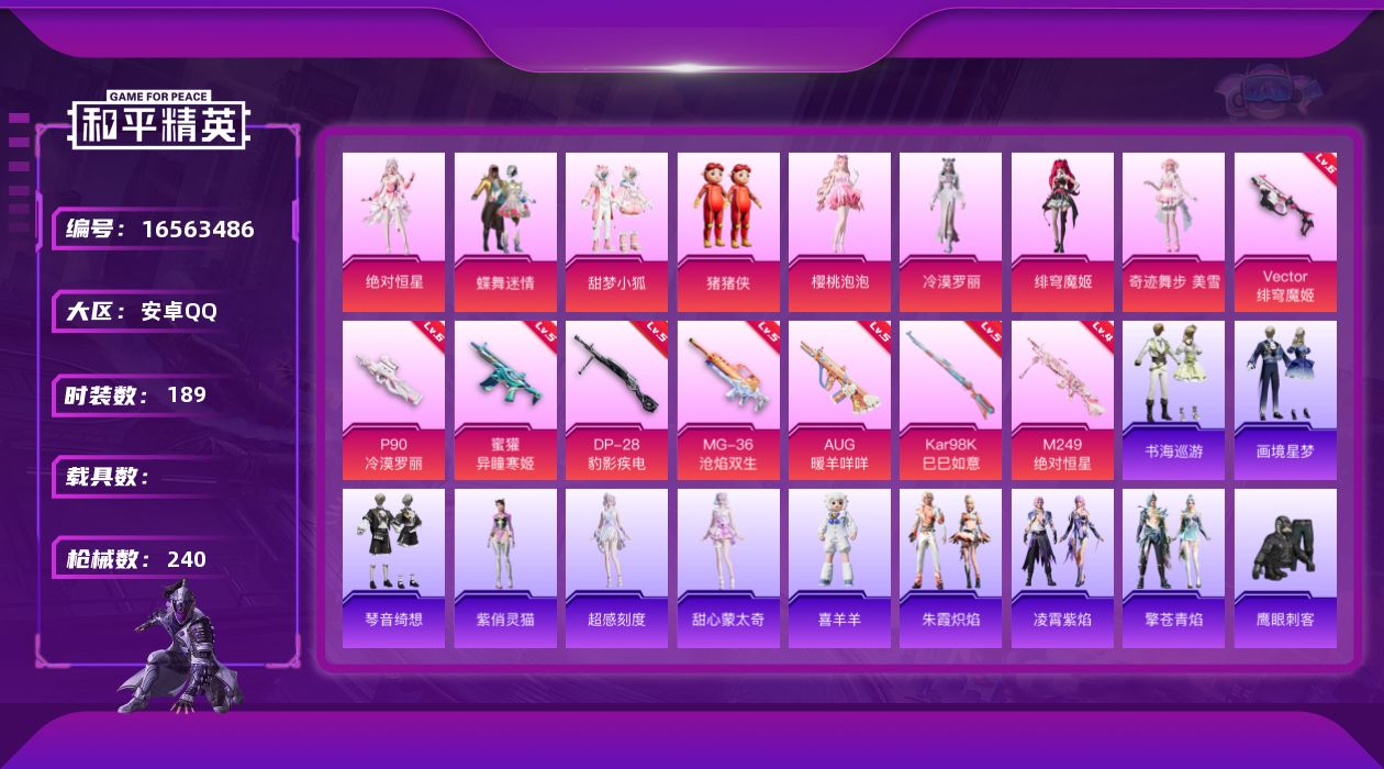 - [7850214]实名: 可修改 时装数: 560 载具数: 1 枪械数: 241 战备数: 174 热门装扮: 浪漫波比,洛天依,恐龙拽拽,庄周梦蝶,奶芙汪汪,启明星,暗夜鎏金,小可学妹,白勺歌姬,呆萌星弥,未来歌姬,烟云彩露 载具: 布加迪威龙(星云粉) 稀有枪皮: M416五爪金龙,M416心之恋语,SCAR-L青春物语,UMP45恐龙拽拽,UMP45启明星,DP-28暗夜鎏金,MG3梦幻舞会,M24莲影清波,AKM绿萝繁花,M24镜域双华,Kar98K-巳巳如意,AMR-智耀战神