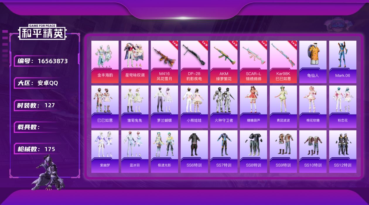 [16563873]安卓 手Q-3粉装-5特效枪-0载具-0粉色飞行器-56529热力值-9王牌印记-127套装-175枪皮