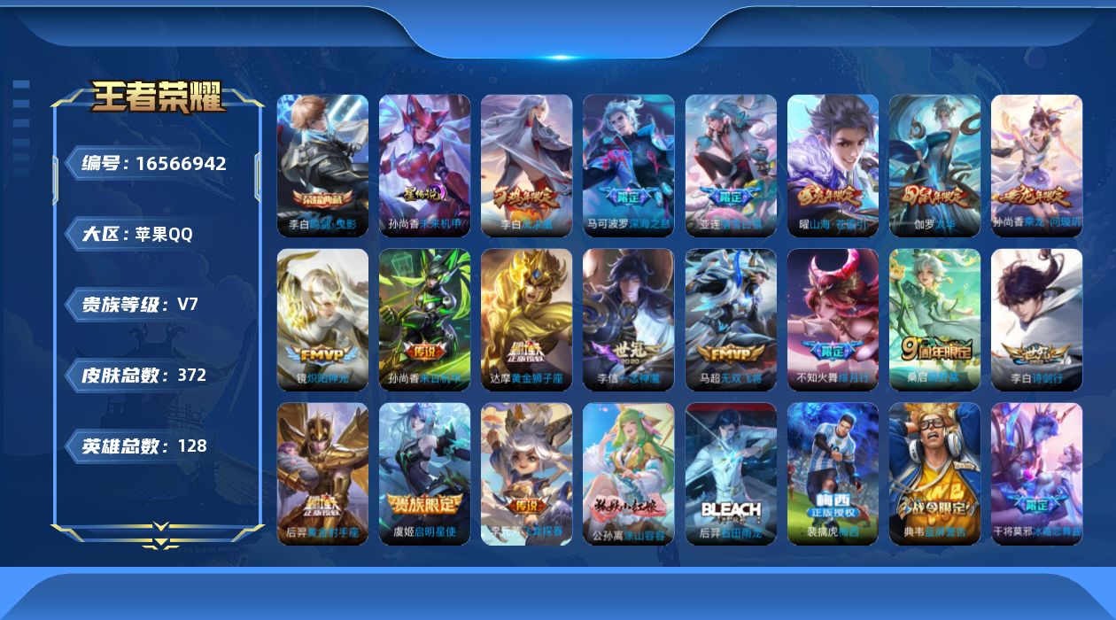[16566942]【店主推荐捡漏号!可直接换绑】苹果Q-V7-至尊星耀II段位-127英雄-371皮肤-1典藏皮肤-18传说-107史诗-1星元 【英雄全皮】:钟馗全皮,猪八戒全皮,影全皮 【荣耀典藏】:李白鸣剑曳影 【传说皮肤】:后羿神树通天,桑启鸣野蒿,亚连落雪白狼,孙尚香乘龙问璇玑,曜山海苍雷引,李白诗剑行,不知火舞绯月行,马可波罗深海之息,马超无双飞将,李元芳飞鸢探春,镜炽阳神光,虞姬启明星使,李信一念神魔,伽罗太华,达摩黄金狮子座,后羿黄金射手座,李白凤求凰,孙尚香末日机甲 【限定皮肤】:蔡文姬夏日便利店,大乔绒语心约,虞姬夏日便利店,姜子牙天穹之誓,狄仁杰阴阳师,赵云皇家上将,嬴政优雅恋人,嬴政白昼王子,鲁班七号狮舞东方,庄周高山流水,高渐离玩趣恶龙,钟无艳超时空战士,扁鹊奇幻香踪,芈月幻夜卜梦,吕布猎兽之王,周瑜赤莲之焰,元歌云间偶戏,元歌无心,夏侯惇朔风刀,甄姬落雪兰心,曹操天狼征服者,典韦蓝屏警告,马可波罗暗影游猎,马可波罗深海之息,狄仁杰魔术师,狄仁杰万华元夜,达摩沙漠行僧,项羽海滩派对,老夫子醍醐杖,老夫子航海奇遇记,程咬金演武夺筹,韩信飞衡,王昭君午后时光,兰陵王驯魔猎人,兰陵王金庭之子,花木兰青春决赛季,不知火舞绯月行,亚瑟潮玩骑士王,孙悟空大圣娶亲,牛魔御旌,后羿圣弓游侠,李元芳银河之约,李元芳云中旅人,虞姬启明星使,钟馗神迹守卫,钟馗驱傩正仪,杨玉环遇见飞天,杨戬潮玩骑兵,女娲朔望之晖,干将莫邪冰霜恋舞曲,干将莫邪真爱魔法,雅典娜黎明之约,鬼谷子原初探秘者,鬼谷子五谷丰年,黄忠火炮绅士,苏烈千军破阵,百里玄策原初追逐者,弈星混沌棋,梦奇顽趣,公孙离蜜橘之夏,公孙离玉兔公主,沈梦溪星空之诺,沈梦溪大漠名商,明世隐疑决卦,裴擒虎李小龙,裴擒虎擒涛扼浪,狂铁御狮,狂铁电玩高手,米莱狄御霄,云中君纤云弄巧,伽罗太华,盾山御銮,猪八戒西部大镖客,猪八戒猪悟能,上官婉儿梁祝,嫦娥拒霜思,嫦娥暖冬兔眠,曜山海苍雷引,鲁班大师探海日志,镜匿光追影者,桑启海盐诗旅,暃星界游侠,司空震地狱燃心,阿古朵江河有灵,张良古海寻踪,裴擒虎梅西,蒙犽百解令,蒙恬荣光圣徽,高渐离燃音魔法,妲己灵卜魔法,鬼谷子天穹祈灯,姬小满妄想食味,孙尚香乘龙问璇玑,百里玄策超元猎域,亚连落雪白狼,沈梦溪龙舞盛年,刘邦剑破天穹,程咬金群星魔术团,刘备异域游侠,周瑜熔金海岸 【年限皮肤】:李白凤求凰,