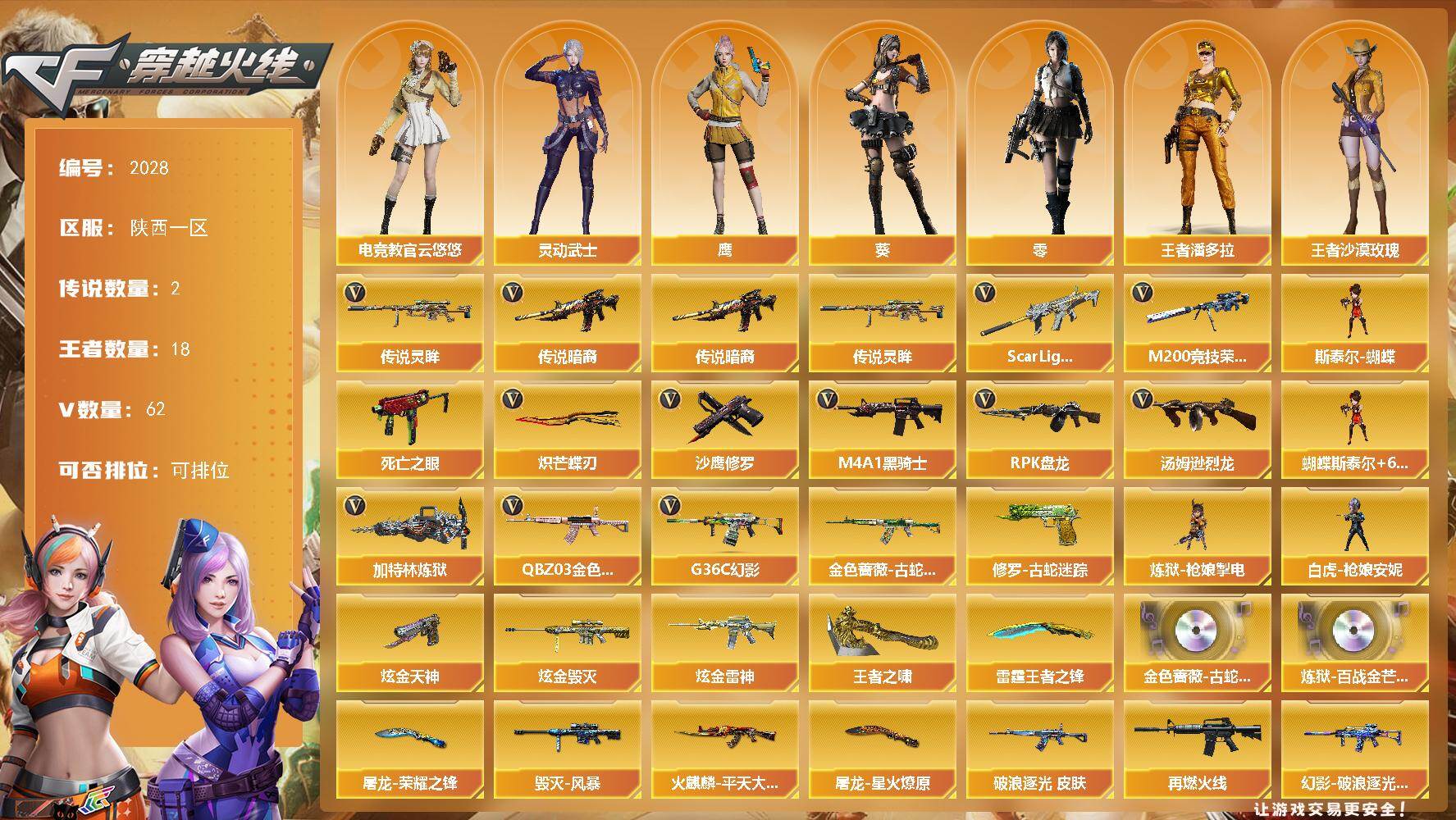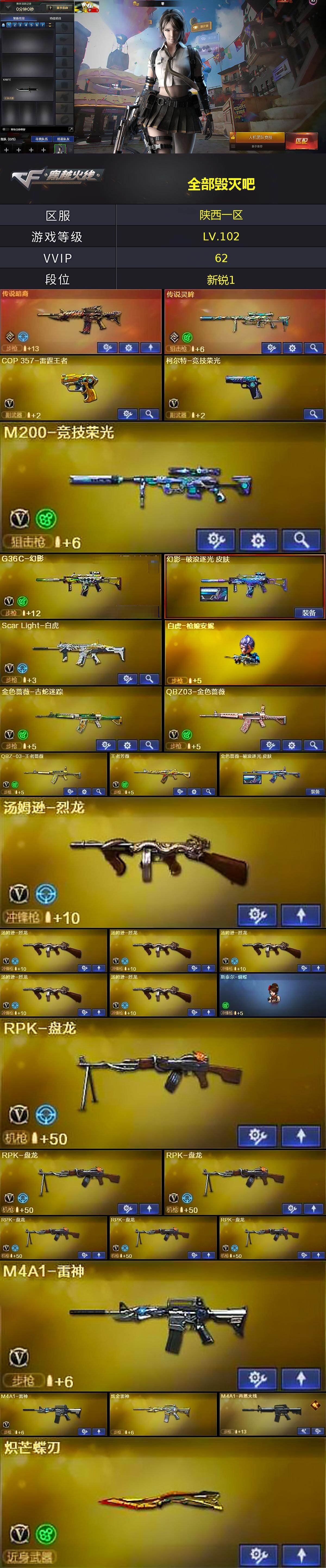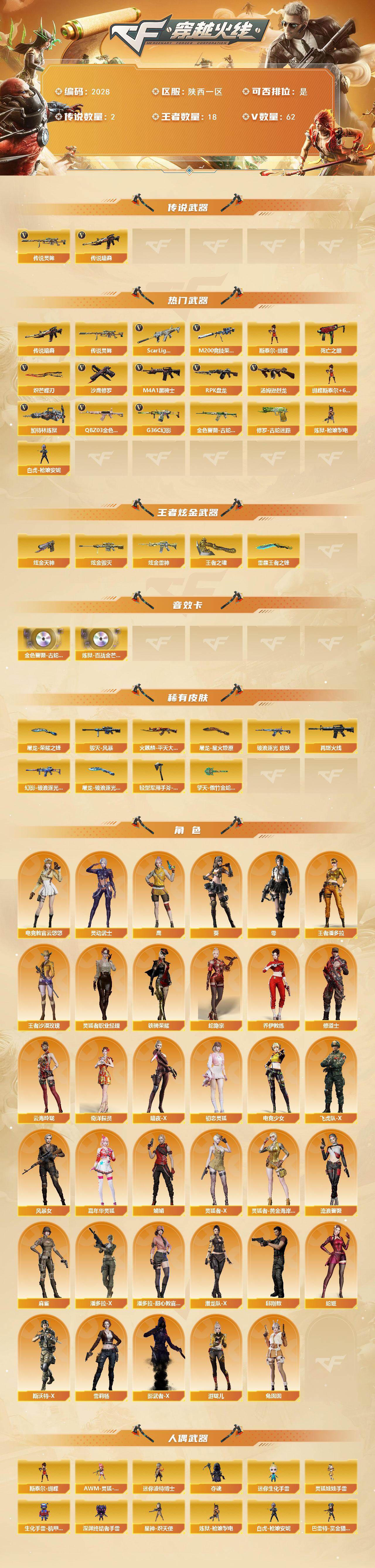 [16570637]陕西一区-74V-18王者武器数-4炫金武器数 【传说武器】:传说暗裔,传说灵眸 【热门武器】:传说暗裔,传说灵眸,G36C-幻影,QBZ03-金色蔷薇,Scar Light-白虎,金色蔷薇-古蛇迷踪,修罗-古蛇迷踪,M200-竞技荣光,死亡之眼*2,M4A1-黑骑士,汤姆逊-烈龙*6,RPK-盘龙*6,加特林-炼狱,斯泰尔-蝴蝶,炼狱-枪娘掣电,白虎-枪娘安妮,沙鹰-修罗,炽芒蝶刃 【王者炫金武器】:王者之啸,雷霆王者之锋*3,炫金雷神,炫金毁灭*2,炫金天神 【音效卡】:QBZ03-金色蔷薇-古蛇迷踪音效卡,炼狱-百战金芒-庆典舞曲音效卡 【皮肤】:金色蔷薇-破浪逐光 皮肤,M4A1-再燃火线,火麒麟-平天大圣,毁灭-风暴,幻影-破浪逐光 皮肤,屠龙-荣耀之锋,屠龙-星火燎原,屠龙-破浪逐光 皮肤,轻型军用手斧-再燃火线,擎天-傲竹金蛇 皮肤 【角色】:零,葵,电竞教官-云悠悠,鹰,王者潘多拉,王者沙漠玫瑰,蛇隐宗,奇洋探员,乔伊教练,修道士,云海玲珑,暗夜-X,初恋灵狐,电竞少女,飞虎队-X,风暴女,嘉年华灵狐,娟娟,灵动武士,灵狐者-X,灵狐者-黄金海岸,灵狐者-职业经理,流浪蔷薇,麻雀,潘多拉-X,潘多拉-甜心教官,潜龙队-X,邱刚敖,蛇姬,斯沃特-X,铁骑荣耀,兔囡囡,雪莉杨,影武者-X,游珑儿 【人偶武器】:星神-炽天使,白虎-枪娘安妮,炼狱-枪娘掣电,迷你钢铁终结者,迷你救赎猎手,斯泰尔-蝴蝶,AWM-灵狐-15周年嘉年华*2,迷你波特博士,夺魂,迷你生化手雷*7,生化手雷-机甲核心*4,深渊终结者手雷*2,巴雷特-赏金猎人,灵狐娃娃手雷 【暴走生化】:死亡之眼*2,超级对讲机 【挑战大师】:冰龙粉碎者-白马银枪,激光毁灭者III-白马银枪,激光毁灭者III,神圣爆裂者-末日III 【英雄级武器】:AK47-火麒麟,M4A1-雷神*2,M4A1-黑骑士,M4A1-死神,AK12-天启,AN94-超新星,Scar Light-白虎,无影-神兵利器,G36C-幻影,黑武士-锦绣游龙,金色蔷薇-古蛇迷踪,M4A1-玫瑰精灵,QBZ03-金色蔷薇,王者之心-觉醒版,王者火魄-觉醒版,黑骑士-海王,QBZ-03-王者蔷薇-觉醒版,王者芳薇-觉醒版,AWM-天龙,Barrett-毁灭,M200-竞技荣光,RPK-盘龙*6,加特林-炼狱,炼狱-百战金芒,汤姆逊-