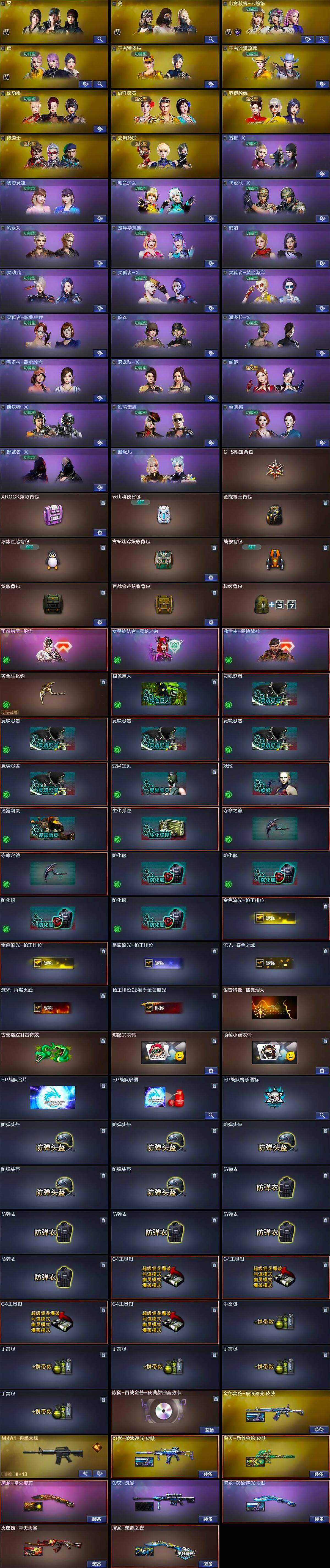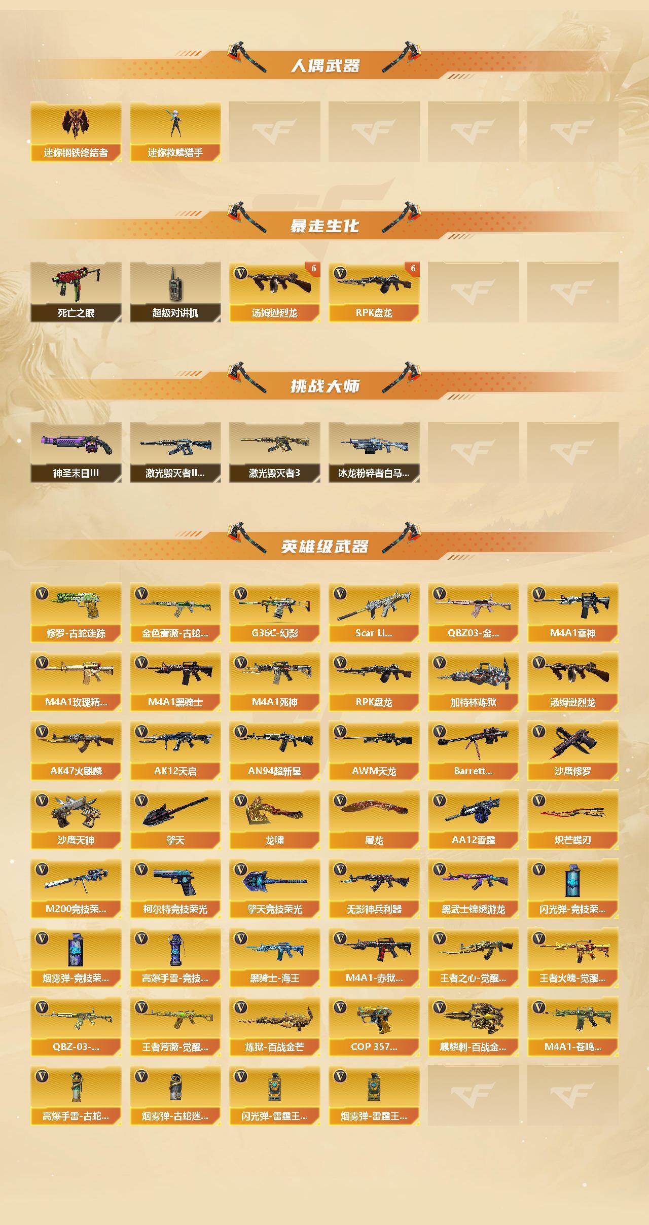 【英雄级武器】:AK47-火麒麟,M4A1-雷神*2,M4A1-黑骑士,M4A1-死神,AK12-天启,AN94-超新星,Scar Light-白虎,无影-神兵利器,G36C-幻影,黑武士-锦绣游龙,金色蔷薇-古蛇迷踪,M4A1-玫瑰精灵,QBZ03-金色蔷薇,王者之心-觉醒版,王者火魄-觉醒版,黑骑士-海王,QBZ-03-王者蔷薇-觉醒版,王者芳薇-觉醒版,AWM-天龙,Barrett-毁灭,M200-竞技荣光,RPK-盘龙*6,加特林-炼狱,炼狱-百战金芒,汤姆逊-