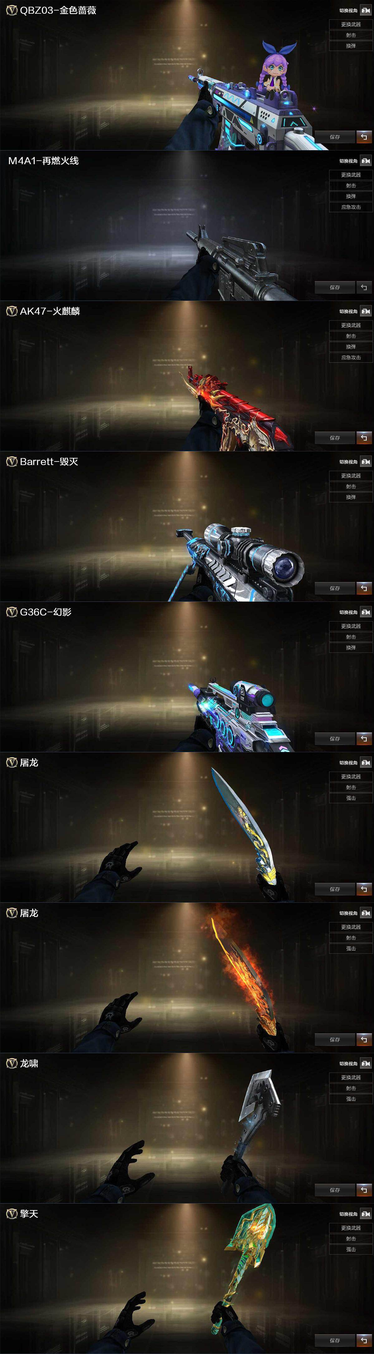 【热门武器】:传说暗裔,传说灵眸,G36C-幻影,QBZ03-金色蔷薇,Scar Light-白虎,金色蔷薇-古蛇迷踪,修罗-古蛇迷踪,M200-竞技荣光,死亡之眼*2,M4A1-黑骑士,汤姆逊-烈龙*6,RPK-盘龙*6,加特林-炼狱,斯泰尔-蝴蝶,炼狱-枪娘掣电,白虎-枪娘安妮,沙鹰-修罗,炽芒蝶刃