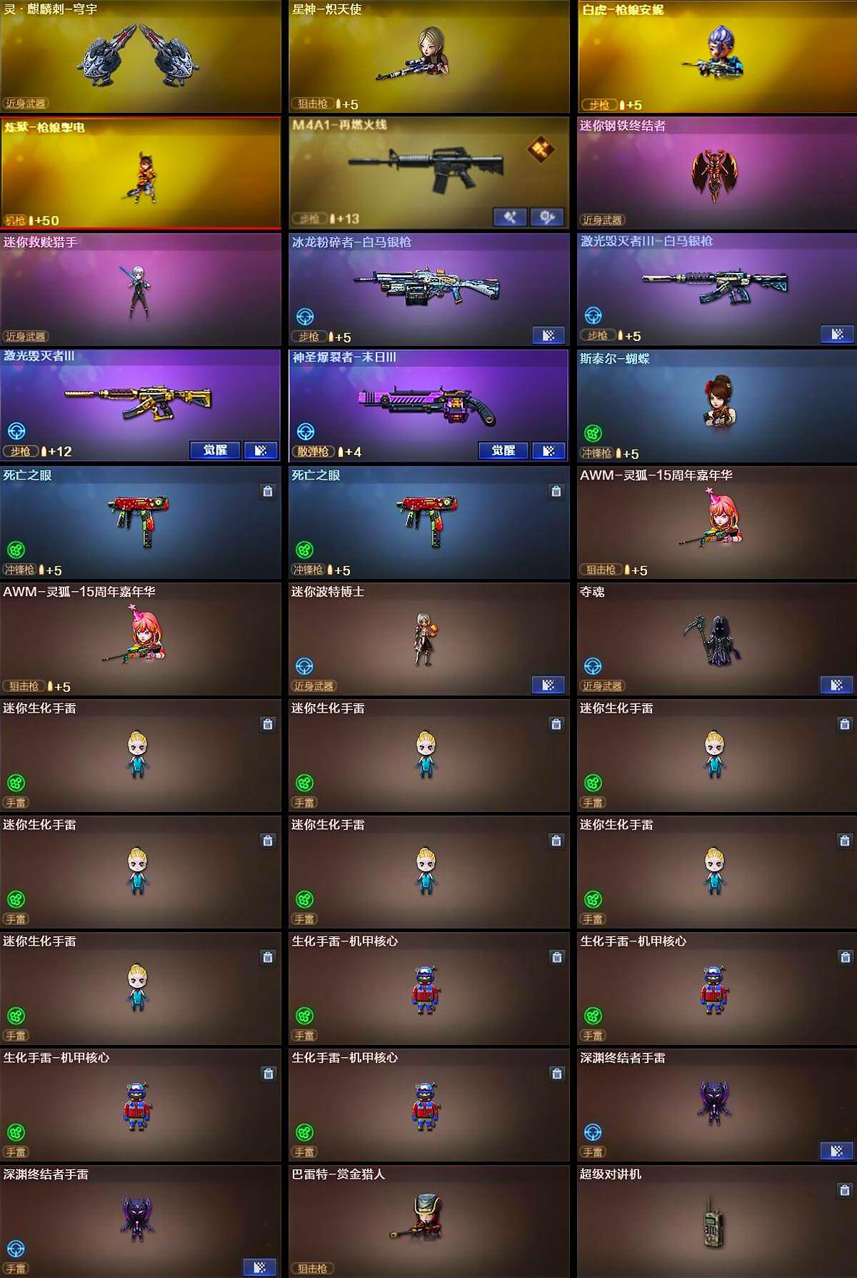 【人偶武器】:星神-炽天使,白虎-枪娘安妮,炼狱-枪娘掣电,迷你钢铁终结者,迷你救赎猎手,斯泰尔-蝴蝶,AWM-灵狐-15周年嘉年华*2,迷你波特博士,夺魂,迷你生化手雷*7,生化手雷-机甲核心*4,深渊终结者手雷*2,巴雷特-赏金猎人,灵狐娃娃手雷