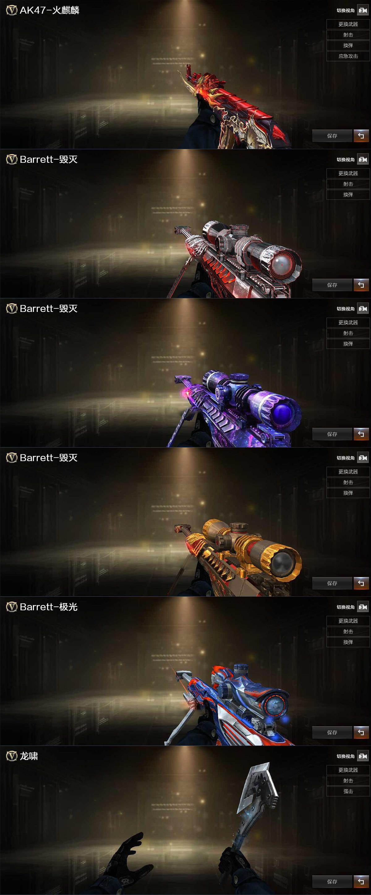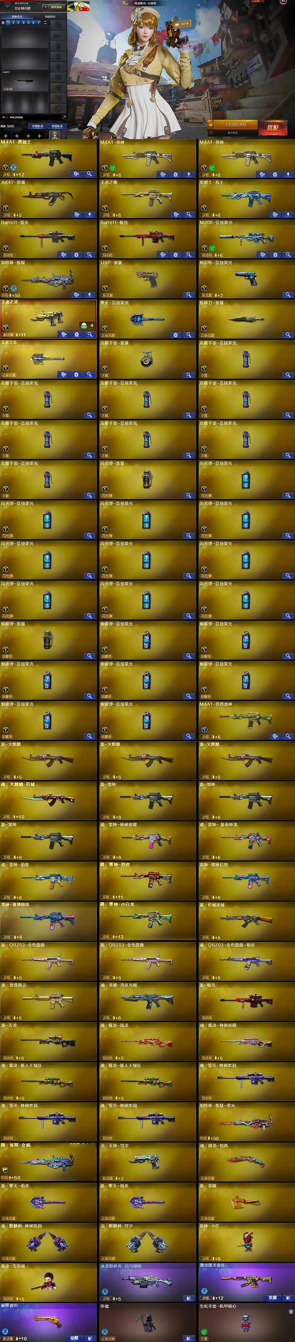 【英雄级武器】:M4A1-黑骑士,M4A1-死神*2,AK47-黑鲨,王者之魄-觉醒版,黑骑士-海王,Barrett-毁灭,Barrett-极光,M200-竞技荣光,加特林-炼狱,USP-雷暴,柯尔特-竞技荣光,王者之灵-觉醒版,擎天-竞技荣光,斩神刀-雷暴,王者之击-觉醒版,高爆手雷-雷暴,高爆手雷-竞技荣光*8,闪光弹-雷暴,闪光弹-竞技荣光*10,烟雾弹-雷暴,烟雾弹-竞技荣光*7,M4A1-苍鸣雷神