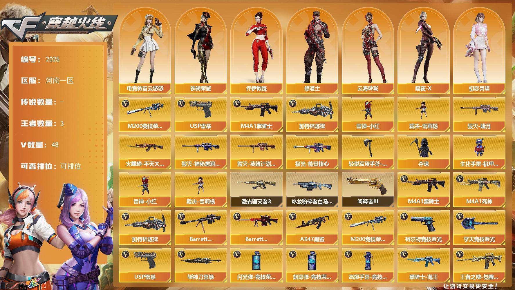 [16571049]河南一区-53V-3王者武器数-0炫金武器数 【热门武器】:M200-竞技荣光,M4A1-黑骑士,加特林-炼狱,雷神-小红,裁决-雪莉杨,USP-雷暴 【皮肤】:火麒麟-平天大圣,毁灭-暗月,毁灭-神秘黑洞皮肤,毁灭-英雄计划 皮肤,极光-能量核心,轻型军用手斧-再燃火线 【角色】:电竞教官-云悠悠,乔伊教练,修道士,云海玲珑,暗夜-X,初恋灵狐,灵狐者-七夕宝贝,龙儿-小淘气,潘多拉-甜心教官,斯沃特-X,铁骑荣耀 【人偶武器】:雷神-小红,裁决-雪莉杨,夺魂,生化手雷-机甲核心 【挑战大师】:冰龙粉碎者-白马银枪,激光毁灭者III,阐释者III 【英雄级武器】:M4A1-黑骑士,M4A1-死神*2,AK47-黑鲨,王者之魄-觉醒版,黑骑士-海王,Barrett-毁灭,Barrett-极光,M200-竞技荣光,加特林-炼狱,USP-雷暴,柯尔特-竞技荣光,王者之灵-觉醒版,擎天-竞技荣光,斩神刀-雷暴,王者之击-觉醒版,高爆手雷-雷暴,高爆手雷-竞技荣光*8,闪光弹-雷暴,闪光弹-竞技荣光*10,烟雾弹-雷暴,烟雾弹-竞技荣光*7,M4A1-苍鸣雷神 【道具】:云山科技背包,亚洲杯纪念炫彩背包,战舰背包,炫彩背包,女皇终结者-魔龙之吻,救世主-黑桃战神,绿色巨人,灵魂忍者,迷雾幽灵,夺命之镰,防化服*3,流光-鎏金之域,炽雪表情,循环实验表情,防弹头盔*6,防弹衣*7,C4工具钳*5,手雷包*4 【特殊枪械】:1黑骑士,1炼狱