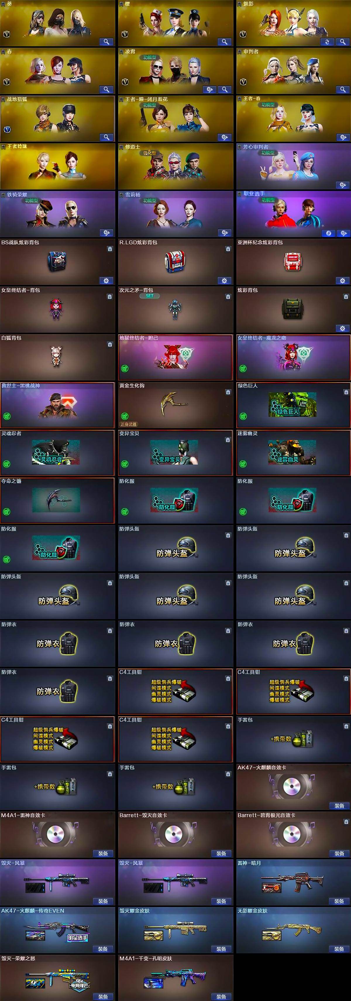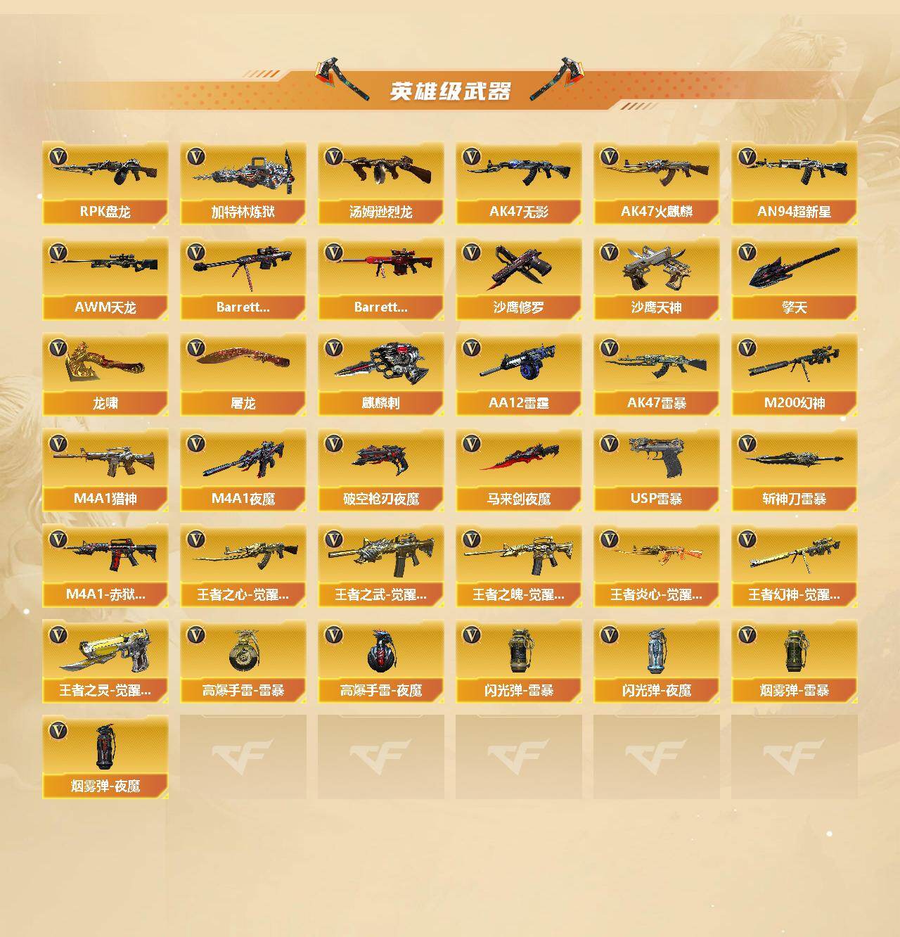 【英雄级武器】:AK47-火麒麟,M4A1-雷神,M4A1-黑骑士*6,AK47-无影,AN94-超新星,AK47-雷暴,M4A1-青龙,HK417-朱雀*2,Scar Light-白虎,M4A1-夜魔,QBZ03-金色蔷薇,M4A1-猎神,王者之心-觉醒版,王者之武-觉醒版,王者之魄-觉醒版,王者炎心-觉醒版,AWM-天龙,Barrett-毁灭,Barrett-极光,M200-幻神,王者幻神-觉醒版,RPK-盘龙*6,加特林-炼狱*2,汤姆逊-烈龙*8,AA-12-雷霆,沙鹰-修罗*5,沙鹰-天神,USP-雷暴*2,破空枪刃-夜魔,王者之灵-觉醒版,屠龙*3,龙啸,马来剑-夜魔,擎天,麒麟刺*2,斩神刀-雷暴,高爆手雷-雷暴*7,高爆手雷-夜魔*7,闪光弹-雷暴*7,闪光弹-夜魔*7,烟雾弹-雷暴*7,烟雾弹-夜魔*7,M4A1-赤狱骑士