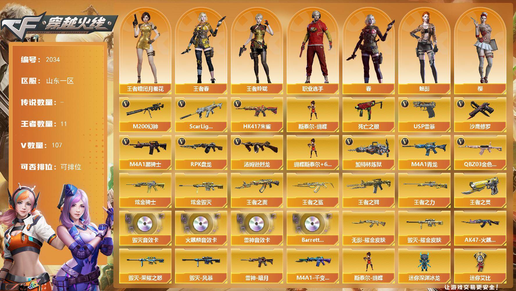 [16571965]山东一区-114V-11王者武器数-2炫金武器数 【热门武器】:QBZ03-金色蔷薇,Scar Light-白虎,HK417-朱雀*2,M4A1-青龙,M200-幻神,死亡之眼,M4A1-黑骑士*6,汤姆逊-烈龙*8,RPK-盘龙*6,加特林-炼狱*2,斯泰尔-蝴蝶,USP-雷暴*2,沙鹰-修罗*5 【王者炫金武器】:王者之鲨,王者之戮,王者之翼,王者之力,王者之灵,炫金骑士,炫金毁灭 【音效卡】:AK47-火麒麟音效卡,M4A1-雷神音效卡,Barrett-毁灭音效卡,Barrett-碧霄极光音效卡 【皮肤】:雷神-暗月,AK47-火麒麟-传奇EVEN,毁灭-荣耀之怒,毁灭耀金皮肤,毁灭-风暴*2,M4A1-千变-孔明皮肤,无影耀金皮肤 【角色】:葵,樱,魅影,春,凌霄,审判者,战地猎狐,王者-瞳-闭月羞花,王者春,王者玲珑,修道士,芳心审判者,邱刚敖,铁骑荣耀,兔囡囡,雪莉杨,职业选手 【人偶武器】:斯泰尔-蝴蝶,M37-葵,COP-旗袍,迷你深渊冰龙*2,迷你裂空之翼*2,迷你波特博士,迷你牛牛,迷你火种,迷你生化手雷,深渊终结者手雷,迷你艾比,迷你超能女侍 【暴走生化】:双面神,死亡之眼 【挑战大师】:神圣爆裂者III,VEPR-12-金魔,激光毁灭者III*3,机甲撕裂者III,试炼破坏者III,KAC-圣炎切割者III,神圣爆裂者-末日III*2 【英雄级武器】:AK47-火麒麟,M4A1-雷神,M4A1-黑骑士*6,AK47-无影,AN94-超新星,AK47-雷暴,M4A1-青龙,HK417-朱雀*2,Scar Light-白虎,M4A1-夜魔,QBZ03-金色蔷薇,M4A1-猎神,王者之心-觉醒版,王者之武-觉醒版,王者之魄-觉醒版,王者炎心-觉醒版,AWM-天龙,Barrett-毁灭,Barrett-极光,M200-幻神,王者幻神-觉醒版,RPK-盘龙*6,加特林-炼狱*2,汤姆逊-烈龙*8,AA-12-雷霆,沙鹰-修罗*5,沙鹰-天神,USP-雷暴*2,破空枪刃-夜魔,王者之灵-觉醒版,屠龙*3,龙啸,马来剑-夜魔,擎天,麒麟刺*2,斩神刀-雷暴,高爆手雷-雷暴*7,高爆手雷-夜魔*7,闪光弹-雷暴*7,闪光弹-夜魔*7,烟雾弹-雷暴*7,烟雾弹-夜魔*7,M4A1-赤狱骑士 【道具】:BS战队炫彩背包,R.LGD炫彩背包,亚洲杯纪念炫彩背包,