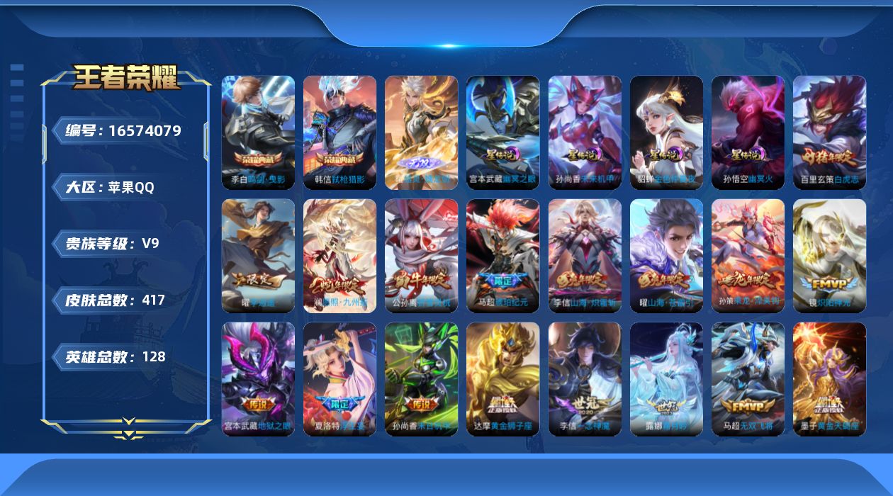 [16574079]可二次【特价出售/店主推荐/1市标/32段打野/31段发育路/31段对抗路/】:苹果Q-V9-永恒钻石V段位-128英雄-417皮肤-2典藏皮肤-1无双-4星元-39传说-121史诗 【英雄全皮】:达摩全皮,孙权全皮,橘右京全皮,刘备全皮,钟馗全皮,李信全皮,马超全皮,戈娅全皮,影全皮 【荣耀典藏】:李白鸣剑曳影,韩信弑枪猎影 【无双皮肤】:曜器灵螭龙剑 【传说皮肤】:澜愿照九州拓,云缨幻光神枪,桑启鸣野蒿,墨子黄金天蝎座,孙策乘龙淬吴钩,马超琥珀纪元,露娜霜月吟,宫本武藏惊梅引,夏洛特浮生妄,曜山海苍雷引,李信山海炽霜斩,吕布怒海麟威,李白诗剑行,不知火舞绯月行,橘右京枫霜尽,马超无双飞将,貂蝉遇见胡旋,赵云淬星耀世,王昭君乞巧织情,曜李逍遥 ,周瑜音你心动,李元芳飞鸢探春,公孙离祈雪灵祝,诸葛亮时雨天司,铠绛天战甲,镜炽阳神光,虞姬启明星使,孙悟空零号赤焰,李信一念神魔,刘备时之恋人,貂蝉猫影幻舞,达摩黄金狮子座,百里玄策白虎志,后羿黄金射手座,貂蝉仲夏夜之梦,孙尚香末日机甲,宫本武藏地狱之眼,孙悟空地狱火,武则天海洋之心 【限定皮肤】:白起狰,姜子牙天穹之誓,杨戬破阵退雄兵,狄仁杰阴阳师,虞姬凯尔特女王,赵云皇家上将,赵云引擎之心,墨子神迹守卫,嬴政优雅恋人,鲁班七号狮舞东方,庄周高山流水,高渐离玩趣恶龙,钟无艳超时空战士,扁鹊奇幻香踪,白起夜都怪侠,芈月重明,芈月幻夜卜梦,吕布御风骁将,元歌云间偶戏,元歌无心,夏侯惇朔风刀,甄姬游园惊梦,甄姬落雪兰心,曹操烛龙,典韦蓝屏警告,马可波罗暗影游猎,马可波罗山海玄木吟,狄仁杰魔术师,狄仁杰万华元夜,达摩星际陆战队,达摩沙漠行僧,项羽海滩派对,老夫子醍醐杖,老夫子航海奇遇记,关羽冰锋战神,关羽百相守梦,貂蝉遇见胡旋,安琪拉魔法小厨娘,程咬金演武夺筹,韩信逐梦之影,韩信傲雪梅枪,兰陵王金庭之子,不知火舞绯月行,橘右京枫霜尽,亚瑟潮玩骑士王,孙悟空至尊宝,孙悟空零号赤焰,牛魔御旌,牛魔奔雷神使,后羿如梦令,后羿圣弓游侠,刘备百相守梦,李元芳云中旅人,虞姬启明星使,钟馗神迹守卫,钟馗驱傩正仪,杨玉环遇见飞天,杨戬潮玩骑兵,女娲朔望之晖,干将莫邪冰霜恋舞曲,干将莫邪真爱魔法,雅典娜单词大作战,雅典娜黎明之约,蔡文姬繁星吟游,太乙真人饕餮,鬼谷子原初探秘者,鬼谷子五谷丰年,诸葛亮时雨天司,黄忠烈魂,黄忠火炮绅士,苏烈千军破阵