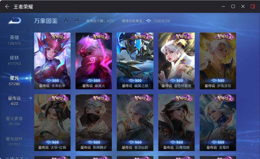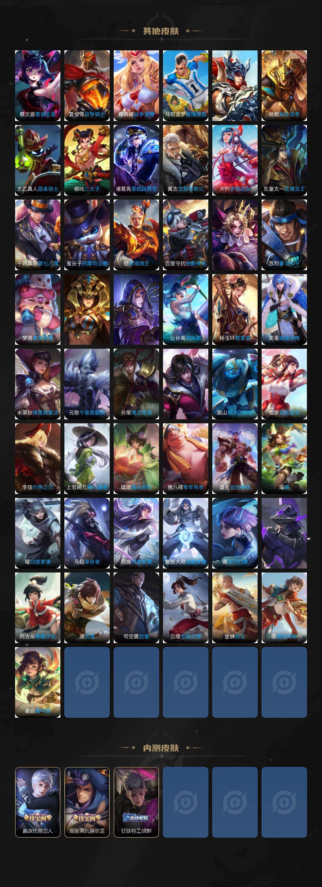 虞姬凯尔特女王,白起狰,太乙真人饕餮,曹操烛龙,芈月重明,狂铁御狮,米莱狄御霄,牛魔御旌,盾山御銮,夏侯惇朔风刀,明世隐疑决卦,老夫子醍醐杖,鬼谷子原初探秘者,狄仁杰万华元夜,程咬金演武夺筹,钟馗驱傩正仪,苏烈千军破阵,女娲朔望之晖,典韦蓝屏警告,钟馗神迹守卫,鲁班七号狮舞东方,马可波罗暗影游猎,蒙犽狂想玩偶喵,元歌云间偶戏,弈星混沌棋,达摩沙漠行僧,兰陵王金庭之子,沈梦溪大漠名商,李元芳云中旅人,桑启海盐诗旅,裴擒虎擒涛扼浪,鲁班大师探海日志,张良古海寻踪,项羽苍威无极,镜青焰无极
