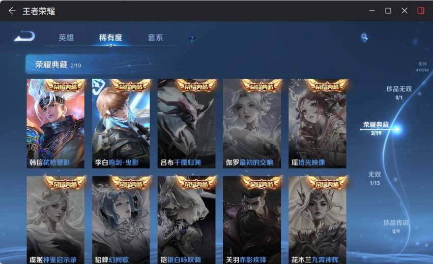 关羽冰锋战神,裴擒虎李小龙,上官婉儿梁祝,牛魔奔雷神使,公孙离祈雪灵祝,吕布御风骁将,诸葛亮时雨天司,黄忠烈魂,马超神威,伽罗天狼溯光者,韩信逐梦之影,百里玄策白虎志,百里守约朱雀志,后羿如梦令,孙悟空至尊宝,雅典娜神奇女侠,干将莫邪冰霜恋舞曲,安琪拉魔法小厨娘,赵云引擎之心,韩信傲雪梅枪,云中君时之祈愿,橘右京枫霜尽,不知火舞绯月行,上官婉儿神器·万象笔,李白诗剑行,马可波罗山海·玄木吟,桑启鸣野蒿,澜愿照·九州拓