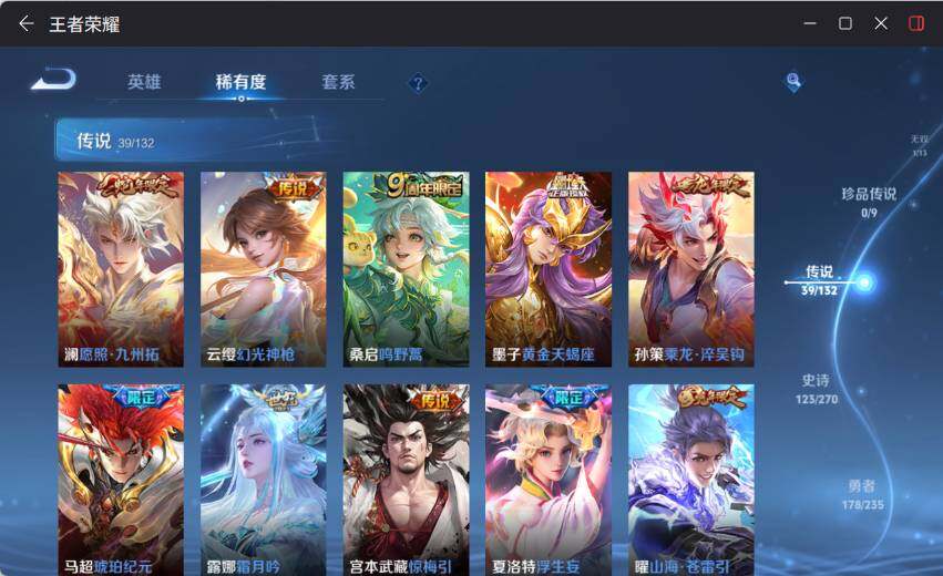 【传说皮肤】:澜愿照九州拓,云缨幻光神枪,桑启鸣野蒿,墨子黄金天蝎座,孙策乘龙淬吴钩,马超琥珀纪元,露娜霜月吟,宫本武藏惊梅引,夏洛特浮生妄,曜山海苍雷引,李信山海炽霜斩,吕布怒海麟威,李白诗剑行,不知火舞绯月行,橘右京枫霜尽,马超无双飞将,貂蝉遇见胡旋,赵云淬星耀世,王昭君乞巧织情,曜李逍遥 ,周瑜音你心动,李元芳飞鸢探春,公孙离祈雪灵祝,诸葛亮时雨天司,铠绛天战甲,镜炽阳神光,虞姬启明星使,孙悟空零号赤焰,李信一念神魔,刘备时之恋人,貂蝉猫影幻舞,达摩黄金狮子座,百里玄策白虎志,后羿黄金射手座,貂蝉仲夏夜之梦,孙尚香末日机甲,宫本武藏地狱之眼,孙悟空地狱火,武则天海洋之心