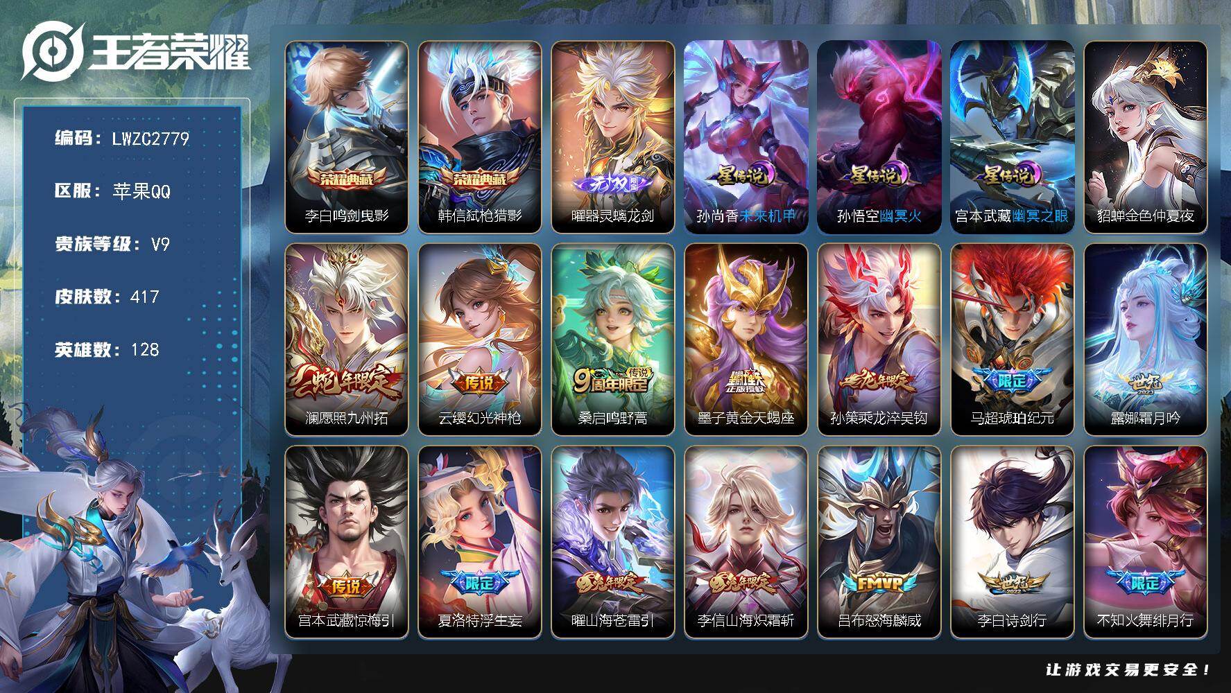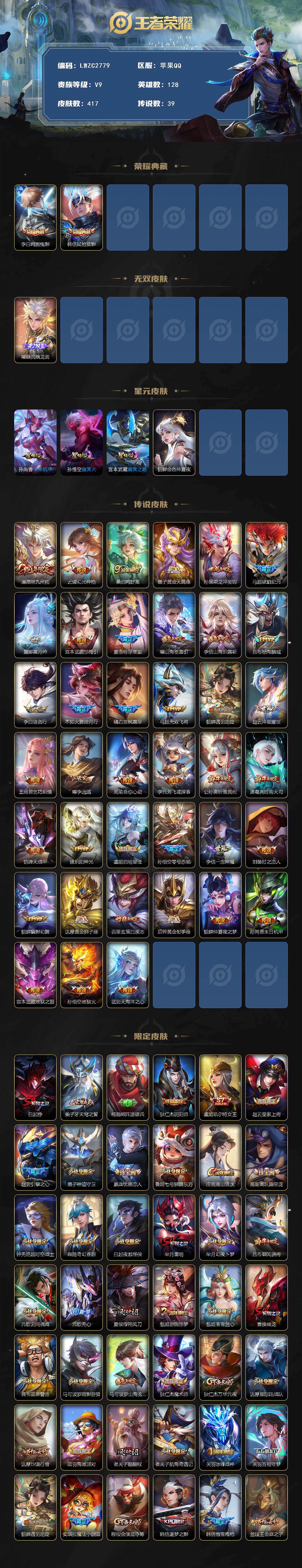 [16574079]可二次【特价出售/店主推荐/1市标/32段打野/31段发育路/31段对抗路/】:苹果Q-V9-永恒钻石V段位-128英雄-417皮肤-2典藏皮肤-1无双-4星元-39传说-121史诗