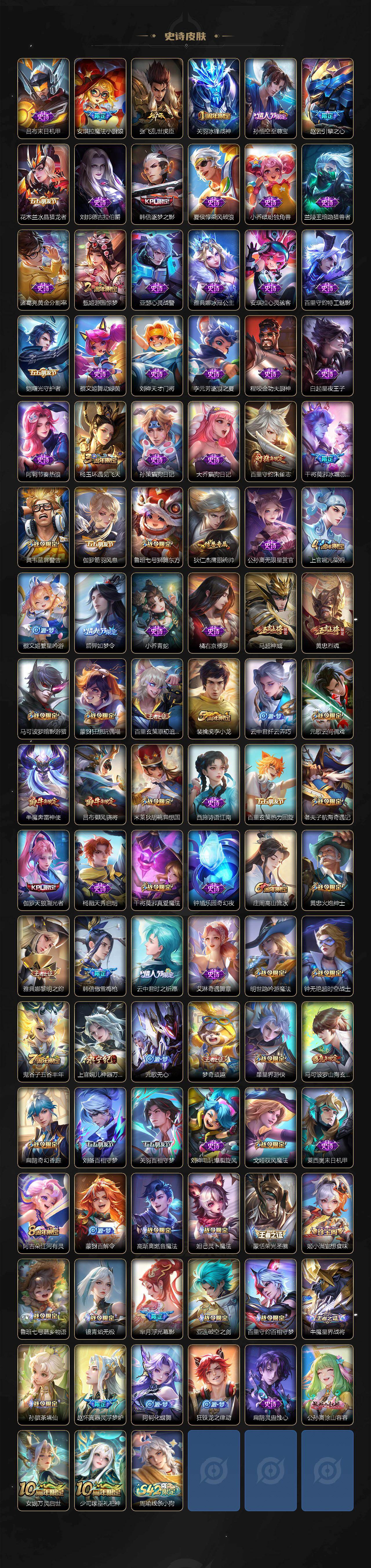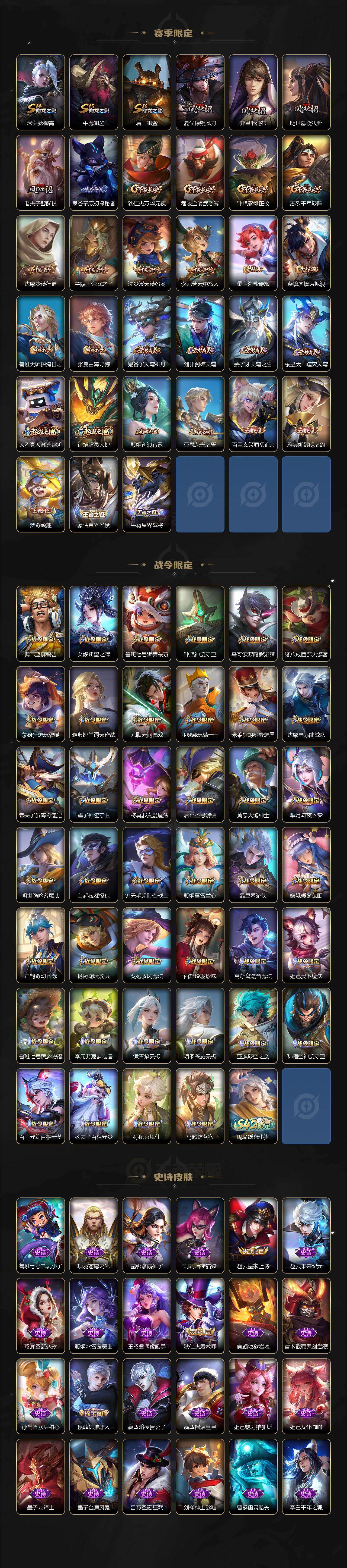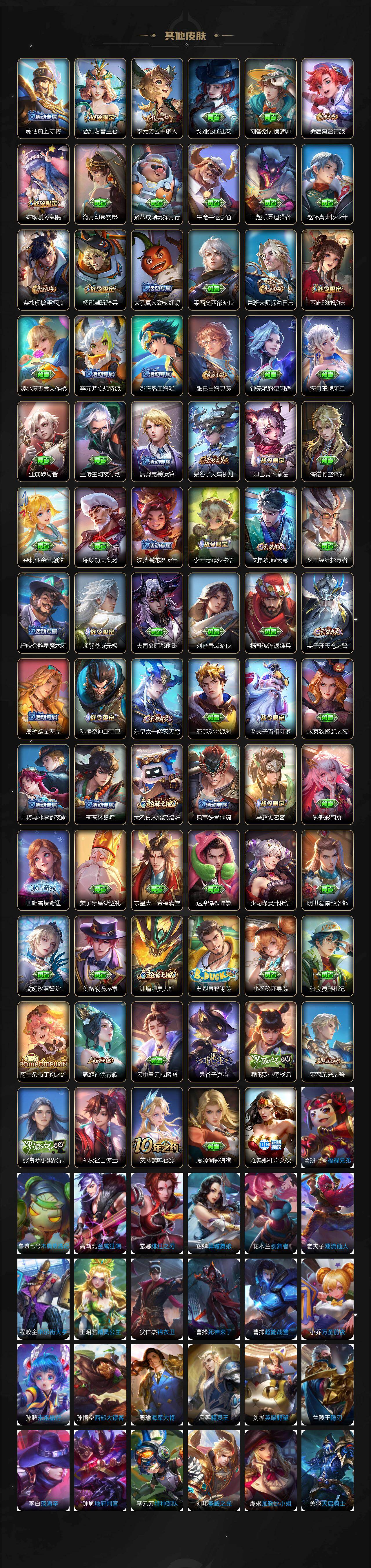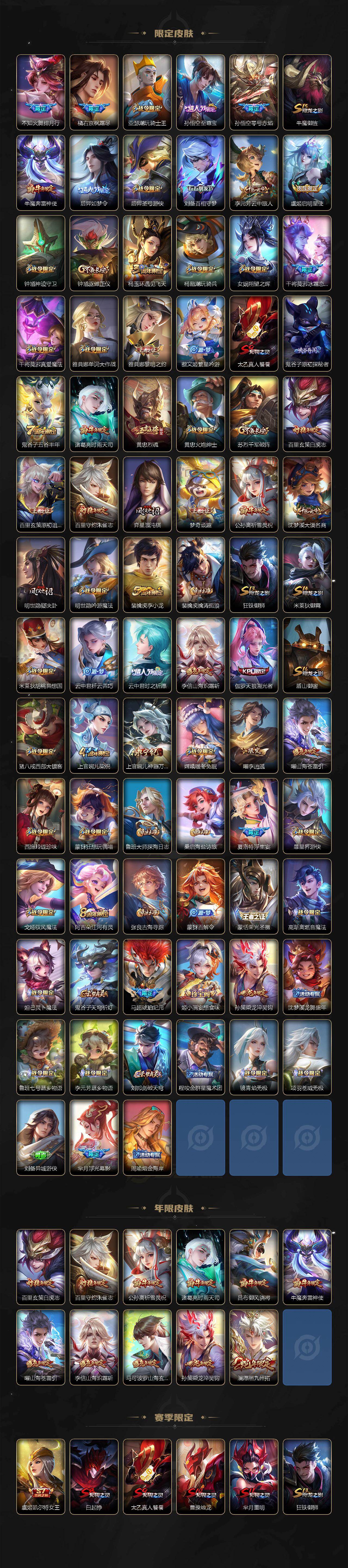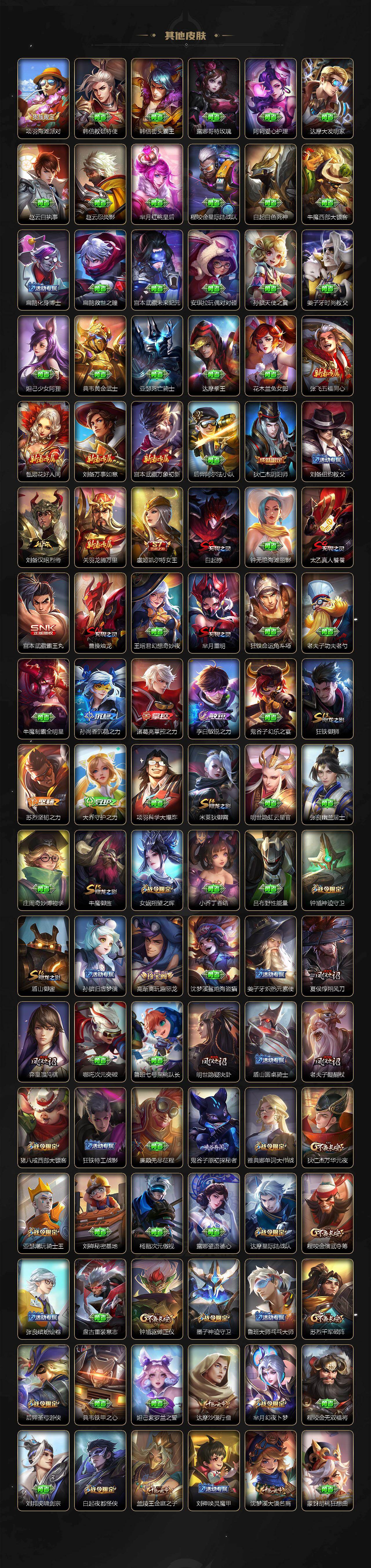【限定皮肤】:白起狰,姜子牙天穹之誓,杨戬破阵退雄兵,狄仁杰阴阳师,虞姬凯尔特女王,赵云皇家上将,赵云引擎之心,墨子神迹守卫,嬴政优雅恋人,鲁班七号狮舞东方,庄周高山流水,高渐离玩趣恶龙,钟无艳超时空战士,扁鹊奇幻香踪,白起夜都怪侠,芈月重明,芈月幻夜卜梦,吕布御风骁将,元歌云间偶戏,元歌无心,夏侯惇朔风刀,甄姬游园惊梦,甄姬落雪兰心,曹操烛龙,典韦蓝屏警告,马可波罗暗影游猎,马可波罗山海玄木吟,狄仁杰魔术师,狄仁杰万华元夜,达摩星际陆战队,达摩沙漠行僧,项羽海滩派对,老夫子醍醐杖,老夫子航海奇遇记,关羽冰锋战神,关羽百相守梦,貂蝉遇见胡旋,安琪拉魔法小厨娘,程咬金演武夺筹,韩信逐梦之影,韩信傲雪梅枪,兰陵王金庭之子,不知火舞绯月行,橘右京枫霜尽,亚瑟潮玩骑士王,孙悟空至尊宝,孙悟空零号赤焰,牛魔御旌,牛魔奔雷神使,后羿如梦令,后羿圣弓游侠,刘备百相守梦,李元芳云中旅人,虞姬启明星使,钟馗神迹守卫,钟馗驱傩正仪,杨玉环遇见飞天,杨戬潮玩骑兵,女娲朔望之晖,干将莫邪冰霜恋舞曲,干将莫邪真爱魔法,雅典娜单词大作战,雅典娜黎明之约,蔡文姬繁星吟游,太乙真人饕餮,鬼谷子原初探秘者,鬼谷子五谷丰年,诸葛亮时雨天司,黄忠烈魂,黄忠火炮绅士,苏烈千军破阵