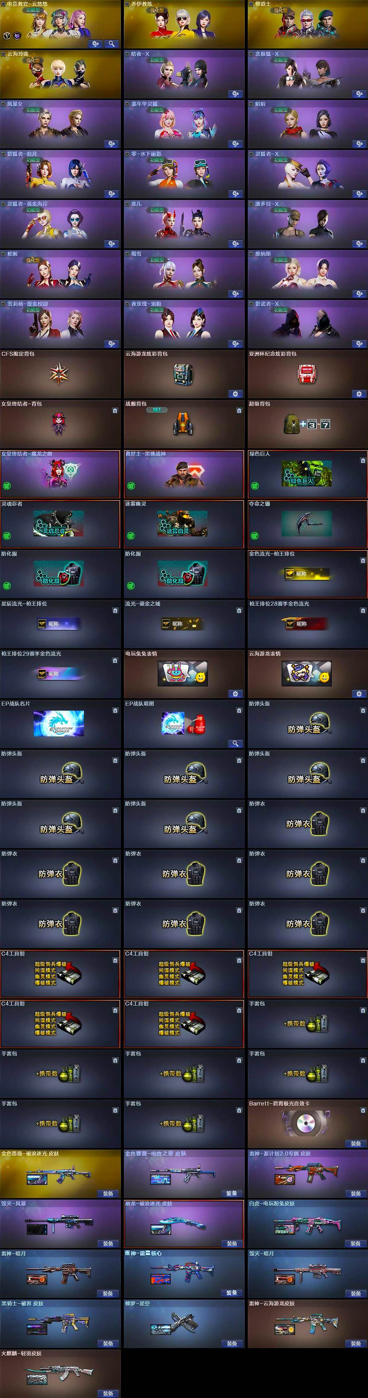 【道具】:CFS限定背包,云海游龙炫彩背包,亚洲杯纪念炫彩背包,女皇终结者-背包,战舰背包,超级背包,女皇终结者-魔龙之吻,救世主-黑桃战神,绿色巨人,灵魂忍者,迷雾幽灵,夺命之镰,防化服*2,金色流光-枪王排位,星辰流光-枪王排位,流光-鎏金之域,枪王排位28赛季金色流光,枪王排位29赛季金色流光,电玩兔兔表情,云海游龙表情,EP战队名片,EP战队喷图,防弹头盔*6,防弹衣*7,C4工具钳*5,手雷包*6