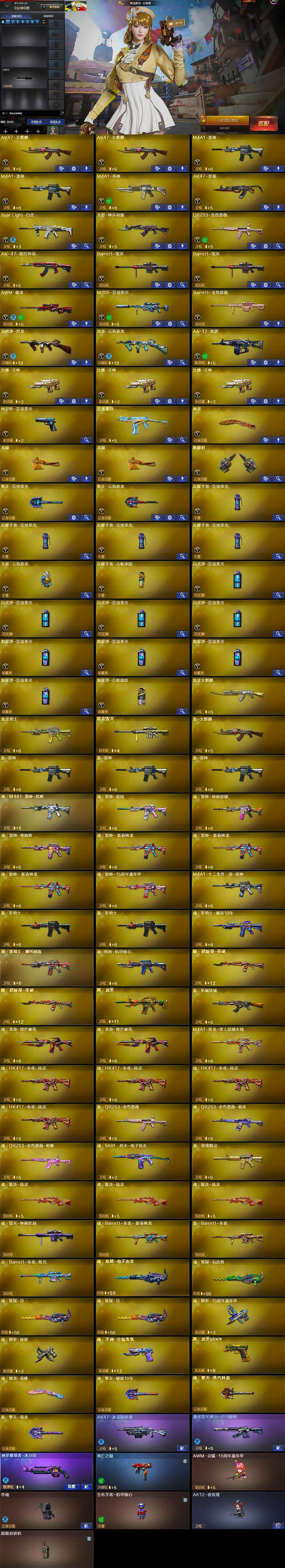 【英雄级武器】:AK47-火麒麟*2,M4A1-雷神*2,M4A1-死神,AK47-黑鲨,Scar Light-白虎,无影-神兵利器,QBZ03-金色蔷薇,AK-47-猩红传说,Barrett-毁灭*2,AWM-裁决,M200-竞技荣光,Barrett-金色蔷薇,汤姆逊-烈龙,烈龙-云海游龙,AA-12-雷霆,沙鹰-天神*3,柯尔特-竞技荣光,屠龙,龙啸*2,麒麟刺,擎天-竞技荣光,擎天-云海游龙,高爆手雷-竞技荣光*4,手雷-云海游龙,高爆手雷-古蛇迷踪,闪光弹-竞技荣光*4,烟雾弹-竞技荣光*4,烟雾弹-古蛇迷踪