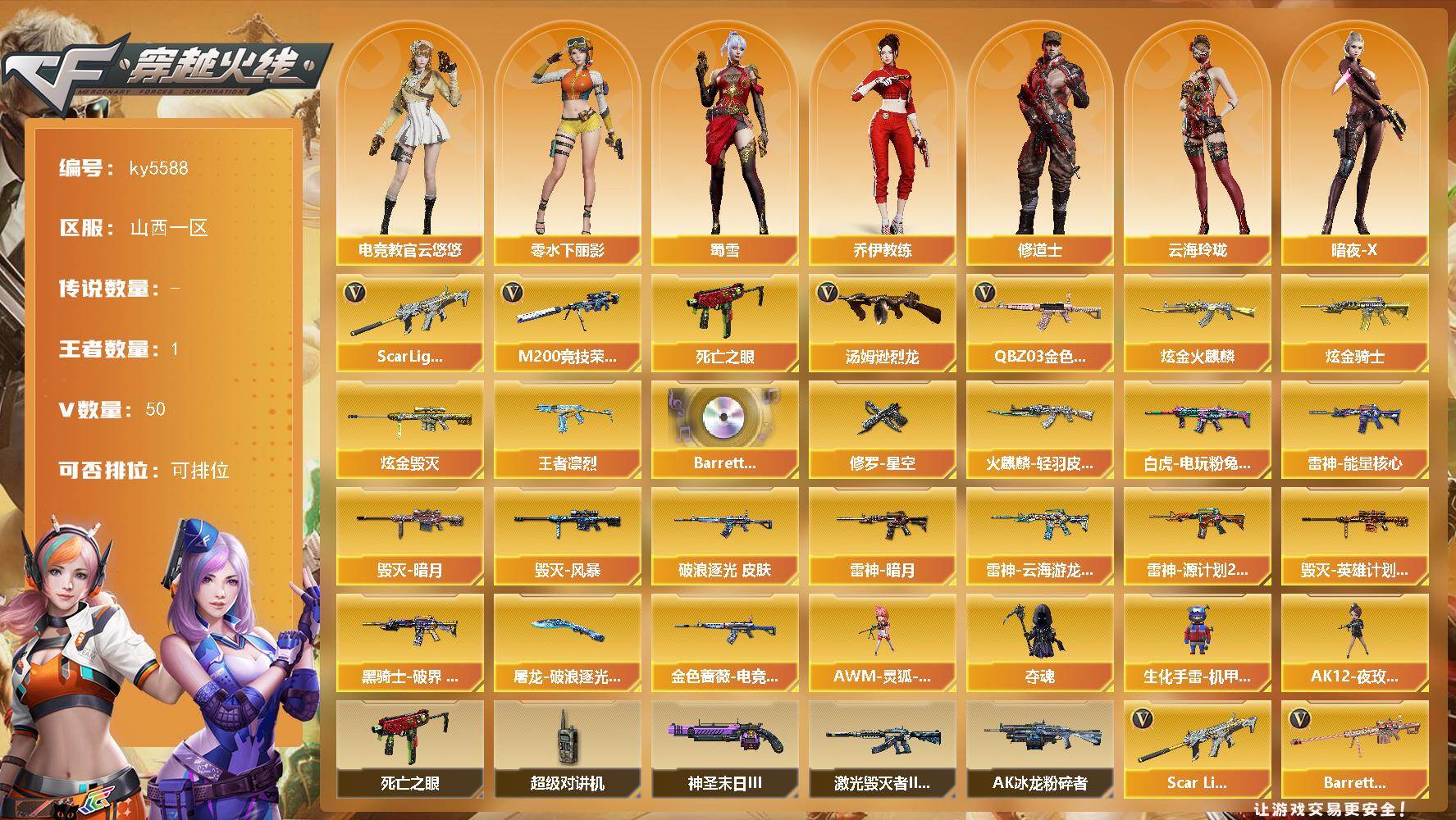 [16574580]山西一区-51V-1王者武器数-3炫金武器数 【热门武器】:QBZ03-金色蔷薇,Scar Light-白虎,M200-竞技荣光,死亡之眼,汤姆逊-烈龙 【王者炫金武器】:王者凛烈,炫金火麒麟,炫金骑士,炫金毁灭 【音效卡】:Barrett-碧霄极光音效卡 【皮肤】:白虎-电玩粉兔皮肤,金色蔷薇-破浪逐光 皮肤,金色蔷薇-电竞之星 皮肤,雷神-暗月,雷神-能量核心,雷神-云海游龙皮肤,雷神-源计划2.0专属 皮肤,火麒麟-轻羽皮肤,毁灭-暗月,毁灭-风暴,毁灭-英雄计划 皮肤,黑骑士-破界 皮肤,修罗-星空,屠龙-破浪逐光 皮肤 【角色】:电竞教官-云悠悠,乔伊教练,修道士,云海玲珑,暗夜-X,北极狐-X,风暴女,嘉年华灵狐,娟娟,猎狐者-追月,零-水下丽影,灵狐者-X,灵狐者-黄金海岸,龙儿,潘多拉-X,蛇姬,蜀雪,兔囡囡,维纳斯,雪莉杨-摸金校尉,夜玫瑰-宠粉,影武者-X 【人偶武器】:AWM-灵狐-15周年嘉年华,夺魂,生化手雷-机甲核心,AK12-夜玫瑰 【暴走生化】:死亡之眼,超级对讲机 【挑战大师】:AK47-冰龙粉碎者,激光毁灭者III-白马银枪,神圣爆裂者-末日III 【英雄级武器】:AK47-火麒麟*2,M4A1-雷神*2,M4A1-死神,AK47-黑鲨,Scar Light-白虎,无影-神兵利器,QBZ03-金色蔷薇,AK-47-猩红传说,Barrett-毁灭*2,AWM-裁决,M200-竞技荣光,Barrett-金色蔷薇,汤姆逊-烈龙,烈龙-云海游龙,AA-12-雷霆,沙鹰-天神*3,柯尔特-竞技荣光,屠龙,龙啸*2,麒麟刺,擎天-竞技荣光,擎天-云海游龙,高爆手雷-竞技荣光*4,手雷-云海游龙,高爆手雷-古蛇迷踪,闪光弹-竞技荣光*4,烟雾弹-竞技荣光*4,烟雾弹-古蛇迷踪 【道具】:CFS限定背包,云海游龙炫彩背包,亚洲杯纪念炫彩背包,女皇终结者-背包,战舰背包,超级背包,女皇终结者-魔龙之吻,救世主-黑桃战神,绿色巨人,灵魂忍者,迷雾幽灵,夺命之镰,防化服*2,金色流光-枪王排位,星辰流光-枪王排位,流光-鎏金之域,枪王排位28赛季金色流光,枪王排位29赛季金色流光,电玩兔兔表情,云海游龙表情,EP战队名片,EP战队喷图,防弹头盔*6,防弹衣*7,C4工具钳*5,手雷包*6 【特殊枪械】:1白虎,1烈龙