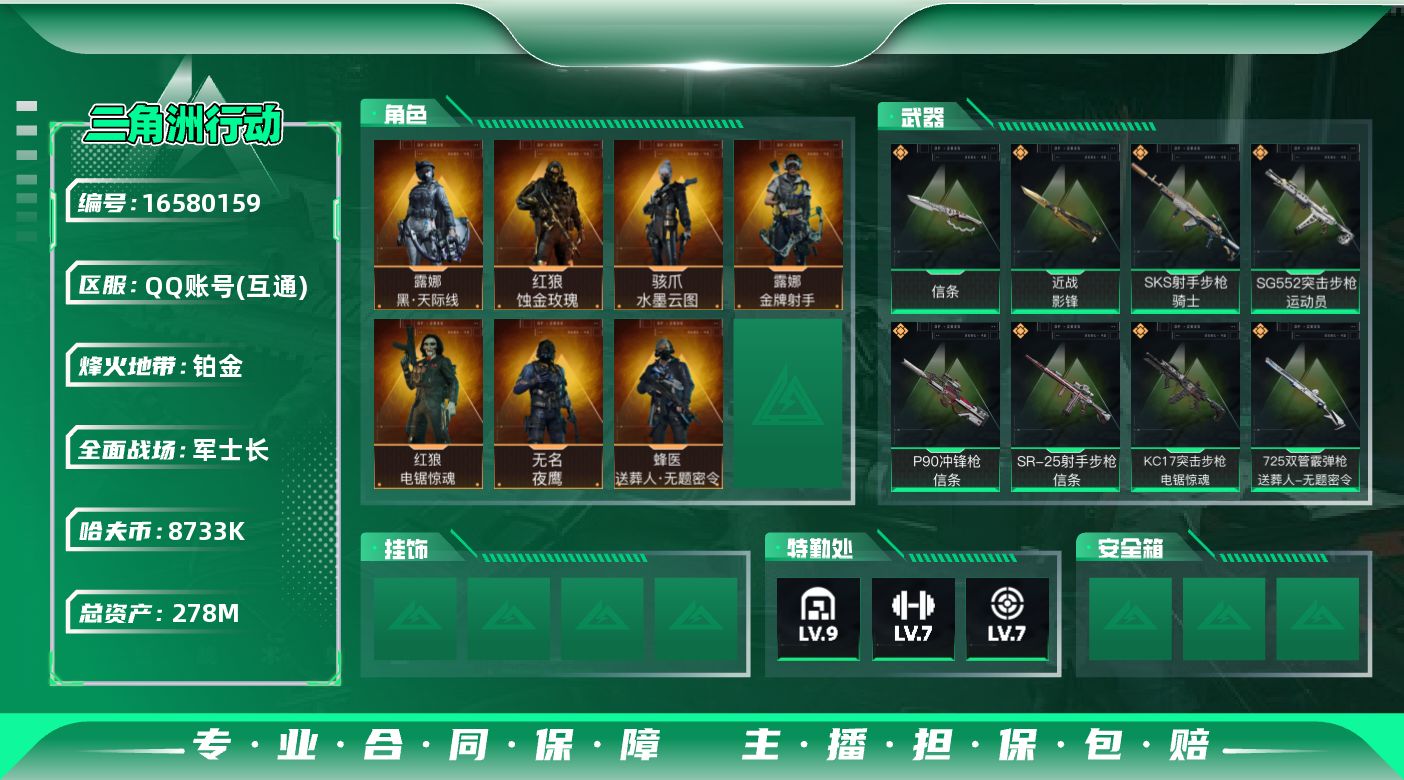 [16580159]【特价出售/店主推荐】278m总资产-8733k哈伏币-60烽火等级-铂金-50战场等级-军士长 【干员外观】:红狼-蚀金玫瑰,骇爪-水墨云图,露娜-黑·天际线,蜂医-送葬人·无题密令,无名-夜鹰,红狼-电锯惊魂,露娜-金牌射手 【近战皮肤】:近战-信条,近战-影锋,近战-黑鹰 【传说外观】:M4A1突击步枪-蚀金玫瑰,M4A1突击步枪-阿米娅,SG552突击步枪-运动员,AK-12突击步枪-夜鹰,SCAR-H战斗步枪-水墨云图,CAR-15突击步枪-阿米娅,腾龙突击步枪-捞点薯条,KC17突击步枪-电锯惊魂,P90冲锋枪-信条,SMG-45冲锋枪-骑士,勇士冲锋枪-能天使-午夜邮差,725双管霰弹枪-送葬人-无题密令,SKS射手步枪-骑士,SR-25射手步枪-信条,AWM狙击步枪-捞点薯条,93R-捞点薯条,复合弓-黑·天际线 【史诗外观】:K437突击步枪-私人定制,PTR-32突击步枪-碎冰行动,M4A1突击步枪-趣味贴纸,AKM突击步枪-林中猎手,ASh-12战斗步枪-守夜人,K416突击步枪-冬日风情,M16A4突击步枪-竞赛选手,AUG突击步枪-蝮蛇,M7战斗步枪-百步穿杨,SG552突击步枪-尖端治疗,SG552突击步枪-深海恐惧,SCAR-H战斗步枪-趣味贴纸,G3战斗步枪-战场英杰,G3战斗步枪-流沙送葬,AS Val突击步枪-尖端治疗,AS Val突击步枪-百步穿杨,腾龙突击步枪-无垢,腾龙突击步枪-猎鳄行动,MP5冲锋枪-趣味贴纸,MP5冲锋枪-深海恐惧,MP5冲锋枪-竞技风,Vector冲锋枪-阿萨拉文明,Vector冲锋枪-百步穿杨,Vector冲锋枪-异域战争,SR-3M紧凑突击步枪-荒野求生,勇士冲锋枪-深海恐惧,MP7冲锋枪-无垢,M1014霰弹枪-林中猎手,S12K霰弹枪-曙光,PKM通用机枪-守夜人,PKM通用机枪-荒野求生,M250通用机枪-囚徒,SVD狙击步枪-暗夜猎手,SVD狙击步枪-荒野求生,M14射手步枪-黑鹰坠落,SR-25射手步枪-尖端治疗,PSG-1射手步枪-无垢,SV-98狙击步枪-林中猎手,SV-98狙击步枪-囚徒,R93狙击步枪-竞赛选手,M700狙击步枪-竞技风,M700狙击步枪-蝮蛇,M700狙击步枪-守夜人,M700狙击步枪-百步穿杨,M700狙击步枪-哈夫克警备,AWM狙击步枪-流沙送葬,.357左