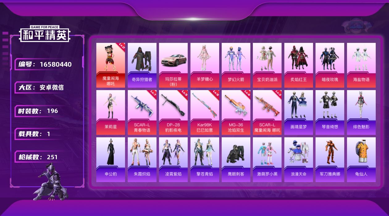 [16580440]【店主推荐捡漏号!可直接换绑】安卓 微信-1神装-7粉装-5特效枪-1载具-4粉色飞行器-84998热力值-14王牌印记-196套装-251枪皮【红色神装等级】:魔童闹海-哪吒(二级)【红色角色神装】:魔童闹海-哪吒【热门品类】:粉装-梦幻火箭,套装-浪漫天命,套装-奇异狩猎者,角色-军刀雅典娜,套装-龟仙人,套装-暗影哥特,角色-Mark.06【粉色套装】:粉装-宝贝奶油派,粉装-梦幻火箭,粉装-炙焰红王,粉装-暗夜玫瑰,粉装-海盐物语,角色-茉莉星,角色-羊梦糖心【粉色枪皮等级】:SCAR-L-青春物语(七级),SCAR-L-魔童闹海 哪吒(三级),Kar98K-巳巳如意(五级),DP-28-豹影疾电(五级),MG-36-沧焰双生(四级)【粉色载具】:玛莎拉蒂Ghibli(粉)【粉色枪皮】:SCAR-L-青春物语,SCAR-L-魔童闹海 哪吒,Kar98K-巳巳如意,DP-28-豹影疾电,MG-36-沧焰双生【粉色飞行器】:星夜魔法师飞行翼,戏水时光飞行器,飞天猪飞行器