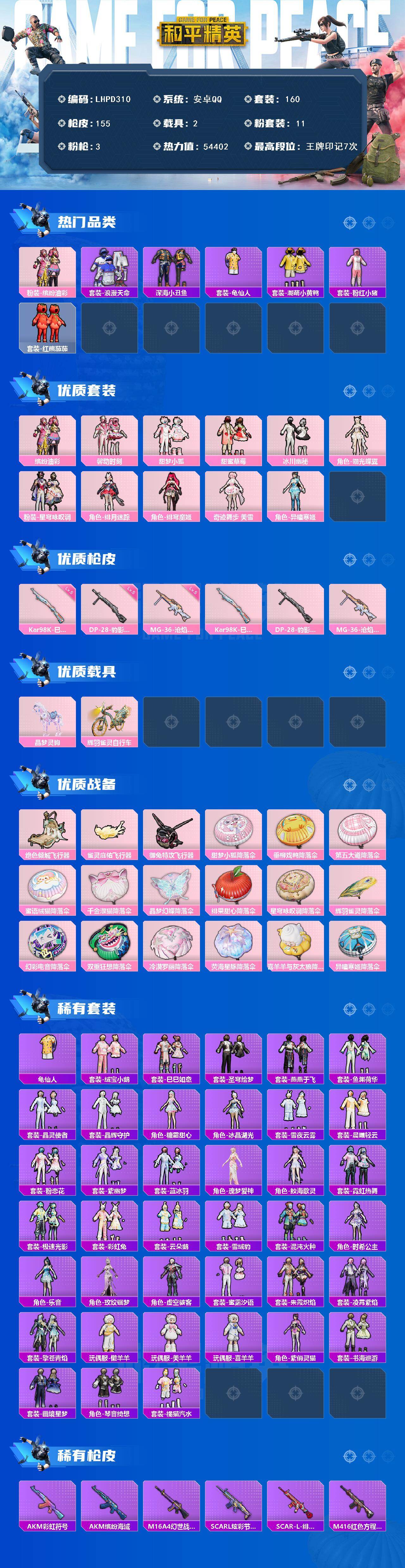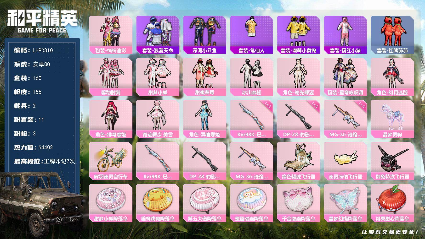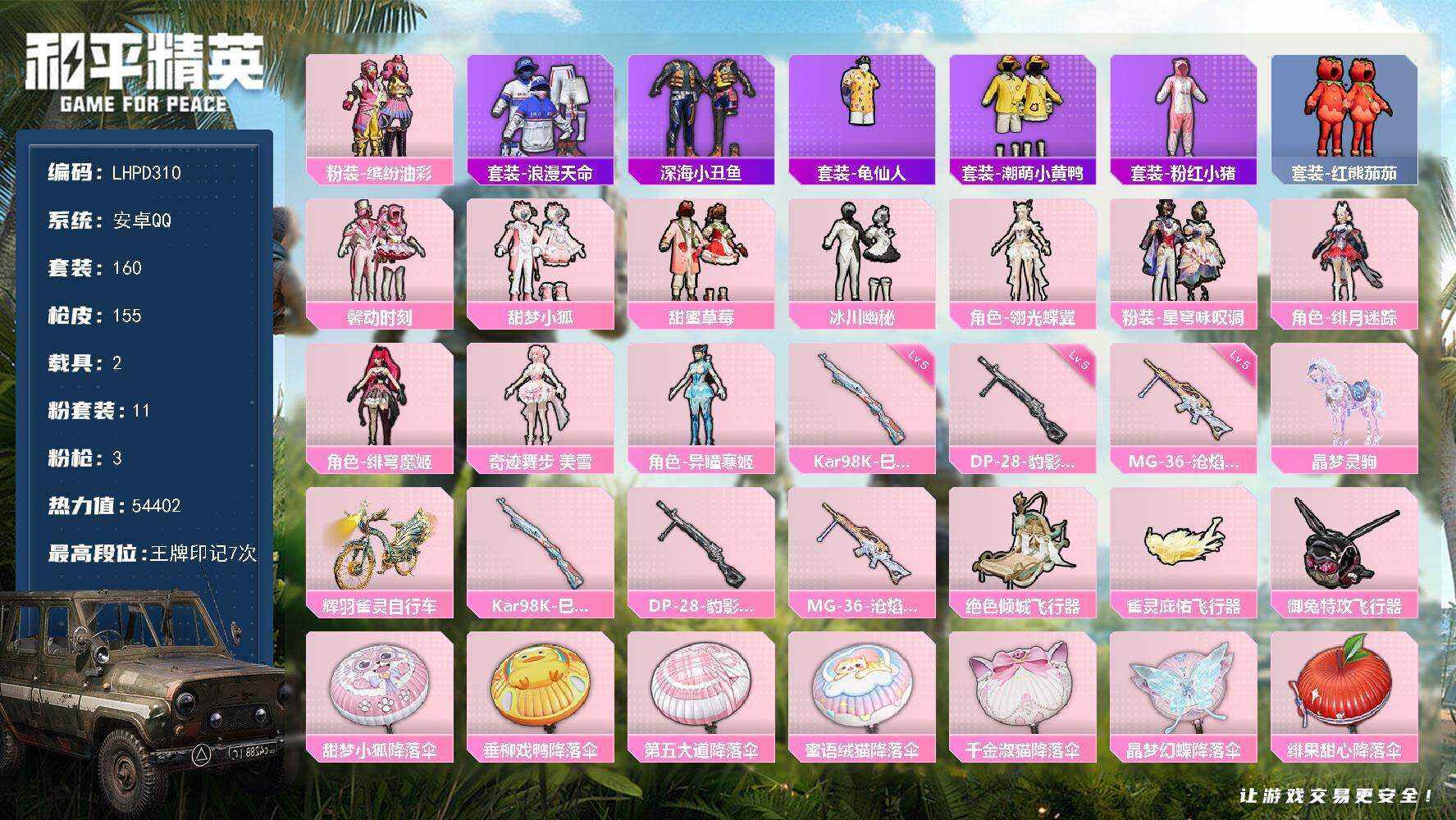 [16580496]【店主推荐捡漏号!可直接换绑】安卓 手Q-11粉装-3特效枪-2载具-5粉色飞行器-54402热力值-7王牌印记-160套装-155枪皮【热门品类】:粉装-缤纷油彩,套装-浪漫天命,套装-深海小丑鱼,套装-龟仙人,套装-潮萌小黄鸭,套装-粉红小猪,套装-红熊茄茄【粉色套装】:粉装-缤纷油彩,粉装-馨动时刻,粉装-甜梦小狐,粉装-甜蜜草莓,粉装-冰川幽秘,角色-翎光蝶翼,粉装-星穹咏叹调,角色-绯月迷踪,角色-绯穹魔姬,角色-奇迹舞步 美雪,角色-异瞳寒姬【粉色枪皮等级】:Kar98K-巳巳如意(五级),DP-28-豹影疾电(五级),MG-36-沧焰双生(五级)【粉色载具】:晶梦灵驹,辉羽雀灵自行车【粉色枪皮】:Kar98K-巳巳如意,DP-28-豹影疾电,MG-36-沧焰双生【粉色飞行器】:绝色倾城飞行器,雀灵庇佑飞行器,御兔特攻飞行器
