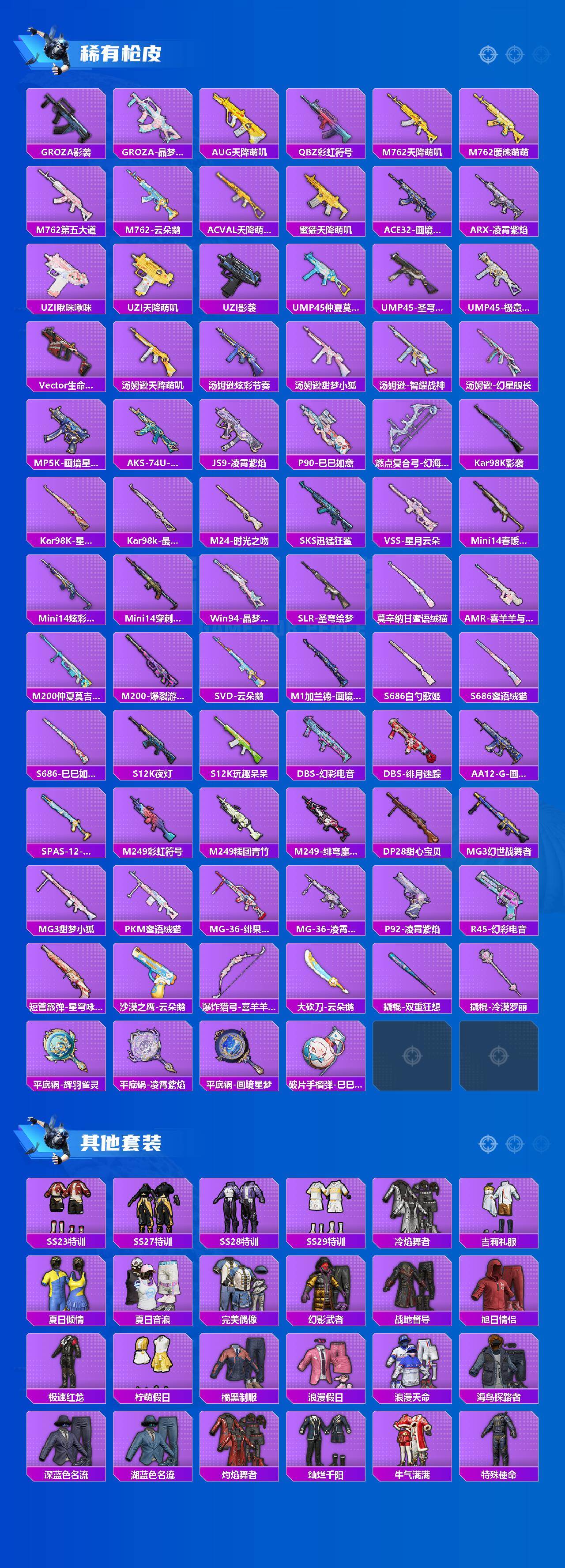 - [14271997]【店主推荐捡漏号!可直接换绑】2191k哈伏币-91m流动资产-60烽火等级-钻石-8战场等级-列兵 【干员外观】:骇爪-维什戴尔,深蓝-不破誓约,红狼-电锯惊魂 【近战皮肤】:近战-信条,近战-黑鹰 【典藏外观】:M14射手步枪-花岗岩,AKM突击步枪-噬菌体*2 【传说级普通外观】:M4A1突击步枪-阿米娅,SG552突击步枪-运动员,AK-12突击步枪-特斯拉线圈,SCAR-H战斗步枪-启航,G3战斗步枪-骑士,KC17突击步枪-电锯惊魂,P90冲锋枪-信条,UZI冲锋枪-特斯拉线圈,SR-3M紧凑突击步枪-特斯拉线圈,勇士冲锋枪-能天使-午夜邮差,M250通用机枪-几何解构,M250通用机枪-骑士之心,SR-25射手步枪-信条,R93狙击步枪-维什戴尔 【史诗级普通外观】:ASh-12战斗步枪-无极限,AUG突击步枪-蝮蛇,G3战斗步枪-流沙送葬,AS Val突击步枪-百步穿杨,K437突击步枪-守护者,MP5冲锋枪-深海恐惧,MP5冲锋枪-战术竞备,MP5冲锋枪-竞技风,Vector冲锋枪-猎鳄行动,Vector冲锋枪-异域战争,勇士冲锋枪-工业狂潮,MP7冲锋枪-守护者,PKM通用机枪-蝮蛇,Mini-14射手步枪-守护者,SV-98狙击步枪-林中猎手,SV-98狙击步枪-囚徒,SV-98狙击步枪-猎鳄行动,M700狙击步枪-竞技风,M700狙击步枪-蝮蛇,M700狙击步枪-百步穿杨,AWM狙击步枪-无极限,复合弓-守护者 【稀有级普通外观】:M4A1突击步枪-零点,M4A1突击步枪-繁盛,AKM突击步枪-战术演练,AKM突击步枪-肃杀,QBZ95-1突击步枪-公平竞技,ASh-12战斗步枪-繁盛,K416突击步枪-碳纤维,M7战斗步枪-捣蛋鬼,AK-12突击步枪-零点,SCAR-H战斗步枪-荣耀列队,SCAR-H战斗步枪-黄昏,G3战斗步枪-战术演练,G3战斗步枪-主宰,腾龙突击步枪-冰天雪地,MP5冲锋枪-弄臣,MP5冲锋枪-哈夫克卫队,P90冲锋枪-黄昏,P90冲锋枪-捣蛋鬼,UZI冲锋枪-亚特兰蒂斯,SMG-45冲锋枪-哈夫克卫队,SMG-45-行动开启,SMG-45冲锋枪-幻影结构,勇士冲锋枪-主宰,勇士冲锋枪-冰天雪地,MP7冲锋枪-幻影结构,MP7冲锋枪-钢铁之躯,M1014霰弹枪-幻影结构,S12K霰弹枪-战术演练,PKM通用机枪-英雄