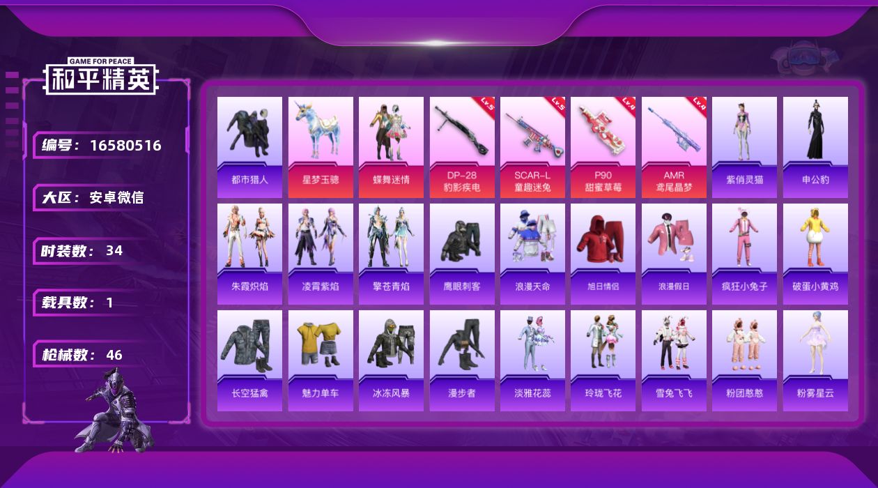 [16580516]【特价出售/店主推荐】安卓 微信-1粉装-4特效枪-1载具-3粉色飞行器-15279热力值-1王牌印记-34套装-46枪皮【热门品类】:套装-浪漫天命,套装-都市猎人【粉色套装】:粉装-蝶舞迷情【粉色枪皮等级】:SCAR-L-童趣迷兔(五级),P90-甜蜜草莓(四级),AMR-鸢尾晶梦(四级),DP-28-豹影疾电(五级)【粉色载具】:星梦玉骢【粉色枪皮】:SCAR-L-童趣迷兔,P90-甜蜜草莓,AMR-鸢尾晶梦,DP-28-豹影疾电【粉色飞行器】:春暖花开飞行器