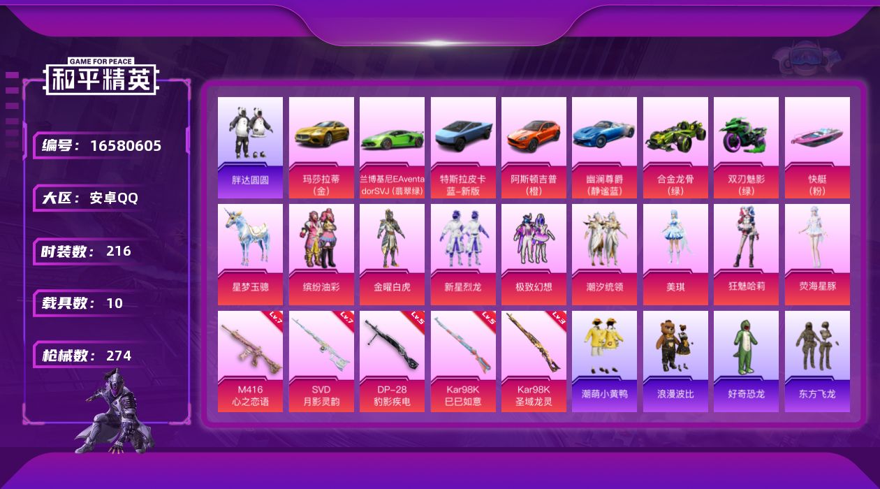 [16580605]【店主推荐捡漏号!可直接换绑】安卓 手Q-8粉装-5特效枪-10载具-4粉色飞行器-97933热力值-4王牌印记-216套装-274枪皮【热门品类】:粉装-缤纷油彩,套装-小丑鱼,套装-胖达圆圆,套装-AG战队服,套装-SS1特训,套装-龟仙人,套装-潮萌小黄鸭,套装-浪漫波比,套装-粉红小猪,熔岩游骑兵连帽夹克【粉色套装】:粉装-金曜白虎,粉装-缤纷油彩,粉装-新星烈龙,粉装-极致幻想,粉装-潮汐统领,角色-美琪,角色-狂魅哈莉,角色-荧海星豚【粉色枪皮等级】:M416-心之恋语(七级),Kar98K-巳巳如意(五级),Kar98K-圣域龙灵(三级),SVD-月影灵韵(七级),DP-28-豹影疾电(五级)【粉色载具】:特斯拉Cybertruck(荒芜蓝),兰博基尼Aventador SVJ(翡翠绿),阿斯顿马丁DBX(橙),玛莎拉蒂Ghibli(金),幽澜尊爵(静谧蓝),合金龙骨(绿),双人摩托-双刃魅影(绿),空客H135-蔚蓝之翼,快艇-塞莎KL27(霓虹粉),星梦玉骢【粉色枪皮】:M416-心之恋语,Kar98K-巳巳如意,Kar98K-圣域龙灵,SVD-月影灵韵,DP-28-豹影疾电【粉色飞行器】:心之恋语飞行翼,夏日绵绵冰飞行器,圣域金龙飞行器