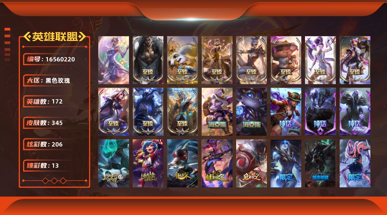 [16560220]【特价出售/店主推荐】未定级段位-172英雄-345皮肤-206炫彩-1终极-18神话-53限定-40传说-74史诗
