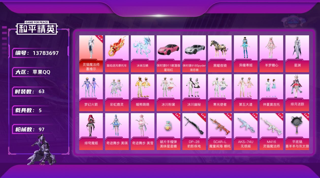 - [16330130]苹果 手Q-1神装-9粉装-10特效枪-2载具-5粉色飞行器-43446热力值-4王牌印记-73套装-133枪皮 【红色神装等级】:灵猫魔法师-塞维尔(一级) 【红色角色神装】:灵猫魔法师-塞维尔 【热门品类】:粉装-繁龙极客,角色-六号稻草人 【粉色套装】:粉装-未来战士,粉装-天使彩虹糖,粉装-绚金战神,粉装-繁龙极客,角色-智耀战神,角色-天龙座 紫龙,粉装-幻彩电音,角色-狂魅哈莉,角色-罗征 【粉色枪皮等级】:M416-灵猫魔法师(三级),AUG-暖羊咩咩(五级),AUG-圣斗士星矢(六级),UZI-圣斗士星矢(三级),Kar98K-巳巳如意(五级),Mk14-甜梦熊击(五级),Mk14-爆裂游戏(四级),AMR-智耀战神(四级),DP-28-豹影疾电(五级),破片手榴弹-瓶中星球(六级) 【粉色载具】:宝马M4(圣保罗黄),黑曜夜骑 【粉色枪皮】:M416-灵猫魔法师,AUG-暖羊咩咩,AUG-圣斗士星矢,UZI-圣斗士星矢,Kar98K-巳巳如意,Mk14-甜梦熊击,Mk14-爆裂游戏,AMR-智耀战神,DP-28-豹影疾电,破片手榴弹-瓶中星球 【粉色飞行器】:萌物绒绒飞行器,繁龙极客飞行器,圣域金龙飞行器,灵猫魔法师飞行器 【粉色降落伞】:甜心宝贝降落伞,繁龙极客降落伞,盛世惊鸿降落伞,赛博古神降落伞,戏水时光降落伞,墨金战记降落伞,圣域龙灵降落伞,圣辉之星降落伞,智耀战神降落伞,幻海仙踪降落伞,星穹咏叹调降落伞,幻彩电音降落伞,双重狂想降落伞,荧海星豚降落伞,灵猫魔法师降落伞,绯穹魔姬降落伞,异瞳寒姬降落伞 【稀有套装】:套装-巳巳如意,套装-圣穹绘梦,套装-小鸟芋圆,套装-燕燕于飞,套装-鱼渊荷华,角色-冷霜之星,套装-粉恋花,套装-紫幽梦,套装-蓝冰羽,角色-瑰梦爱神,角色-六号稻草人,角色-幽澜祭司,套装-星影赞美诗,套装-星渊小夜曲,套装-霓虹热舞,套装-彩虹兔,套装-云朵鹅,套装-雪绒豹,套装-混沌火种,套装-蓝海鲸歌,角色-夜瞳黯灵,套装-朱霞炽焰,套装-凌霄紫焰,角色-绯色魅影,套装-炫彩糖果 【稀有枪皮】:AUG-冰晶雪宝,AKM-灵猫魔法师,AKM-玄冥寒域,SCAR-L-炫彩节奏,SCAR-L-玉兔迎春,M416-萌萌史莱姆,GROZA-酷泡奶龙,M762-甜心宝贝,M762-云朵鹅,G36C-星穹咏叹调,AC-VAL-天降