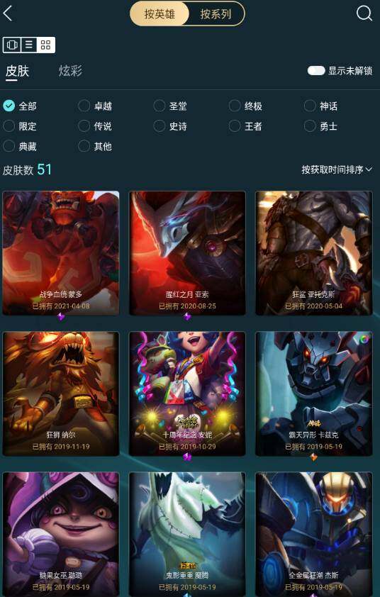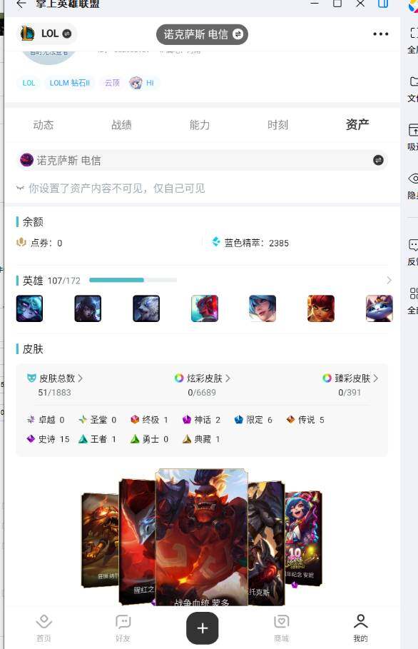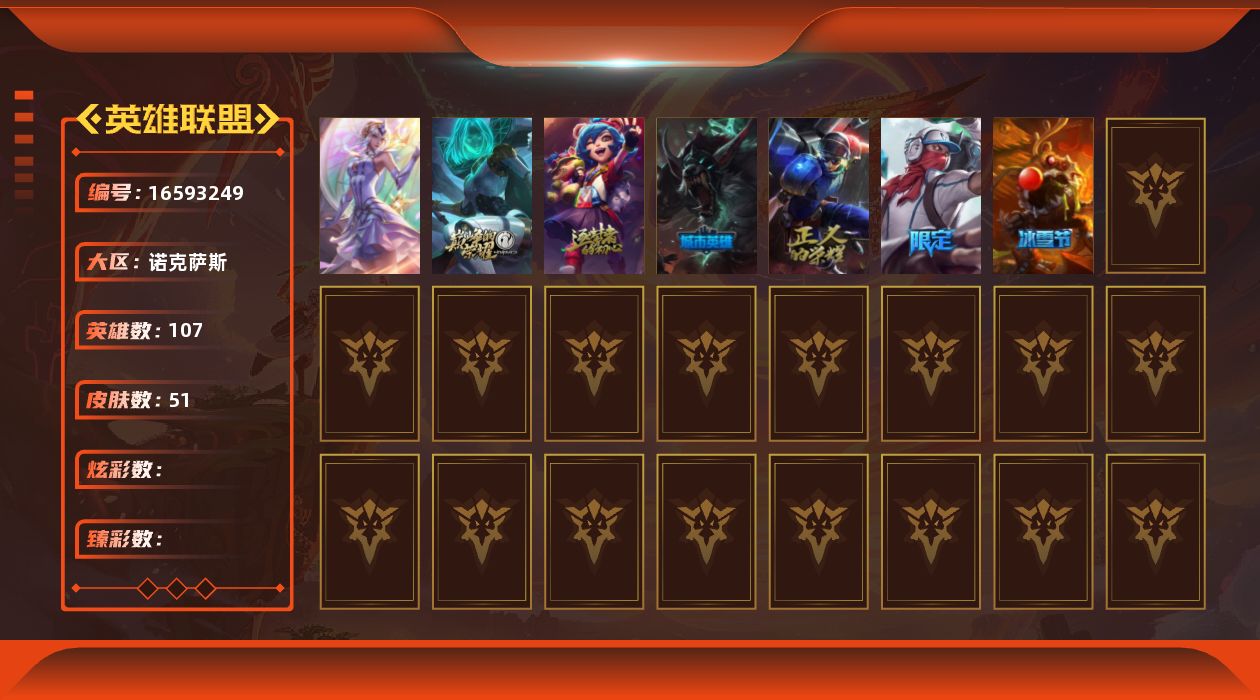 [16593249]未定级段位-107英雄-51皮肤-0炫彩-1终极-2神话-6限定-5传说-15史诗