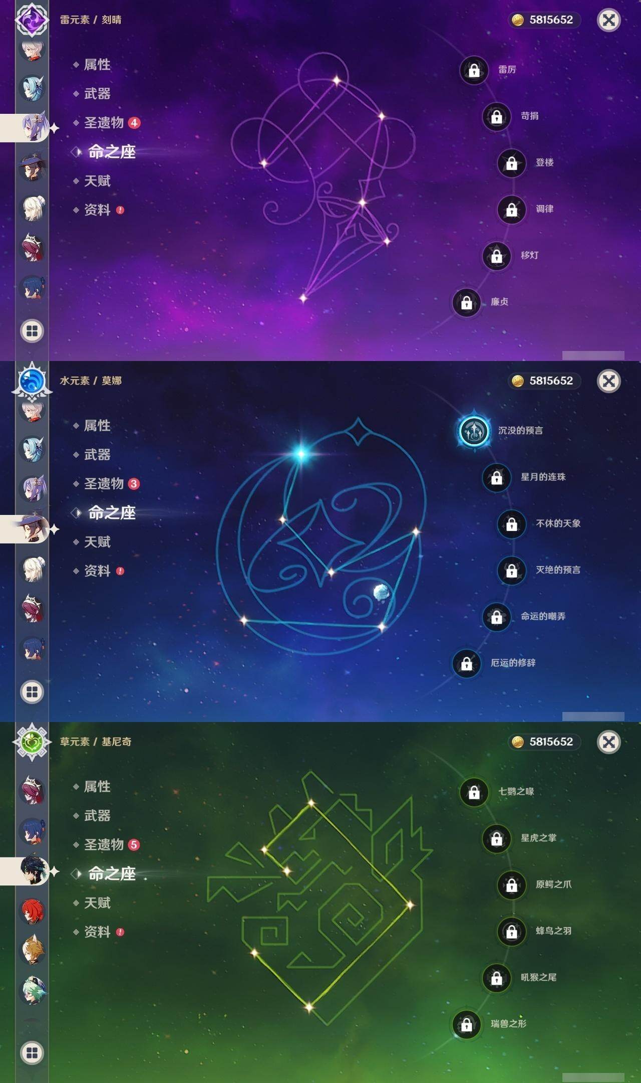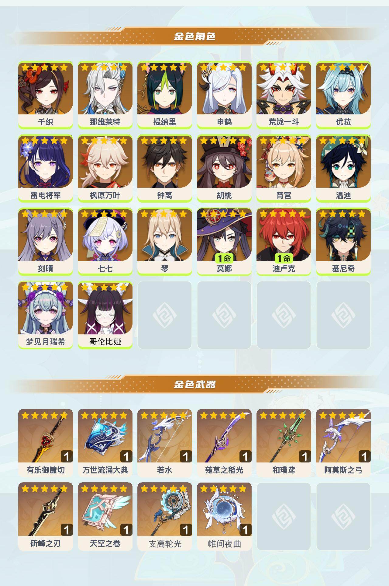 0命千织,0命那维莱特,0命提纳里,0命申鹤,0命荒泷一斗,0命优菈,0命雷电将军,0命枫原万叶,0命钟离,0命胡桃,0命宵宫,0命温迪,0命刻晴,0命七七,0命琴,1命莫娜,1命迪卢克,0命基尼奇,0命梦见月瑞希,0命哥伦比娅,精1有乐御簾切,精1万世流涌大典,精1若水,精1薙草之稻光,精1和璞鸢,精1阿莫斯之弓,精1斫峰之刃,精1天空之卷,精1支离轮光,精1帷间夜曲