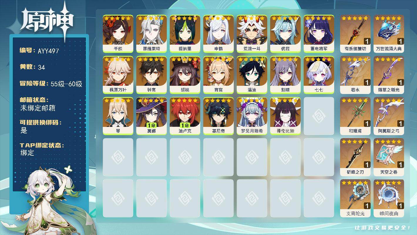 [16593384]59级/34黄/女主/20个五星角色/12个五星武器 0命千织,0命那维莱特,0命提纳里,0命申鹤,0命荒泷一斗,0命优菈,0命雷电将军,0命枫原万叶,0命钟离,0命胡桃,0命宵宫,0命温迪,0命刻晴,0命七七,0命琴,1命莫娜,1命迪卢克,0命基尼奇,0命梦见月瑞希,0命哥伦比娅,精1有乐御簾切,精1万世流涌大典,精1若水,精1薙草之稻光,精1和璞鸢,精1阿莫斯之弓,精1斫峰之刃,精1天空之卷,精1支离轮光,精1帷间夜曲