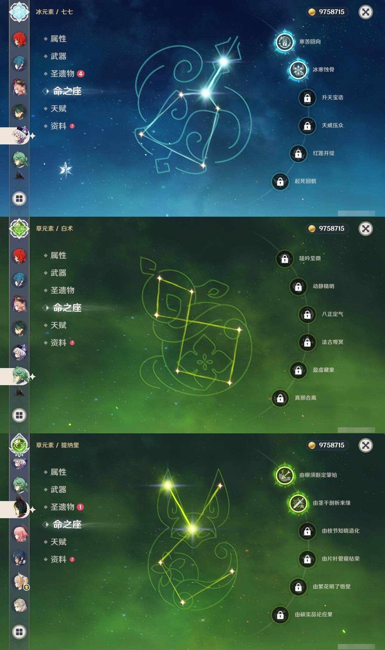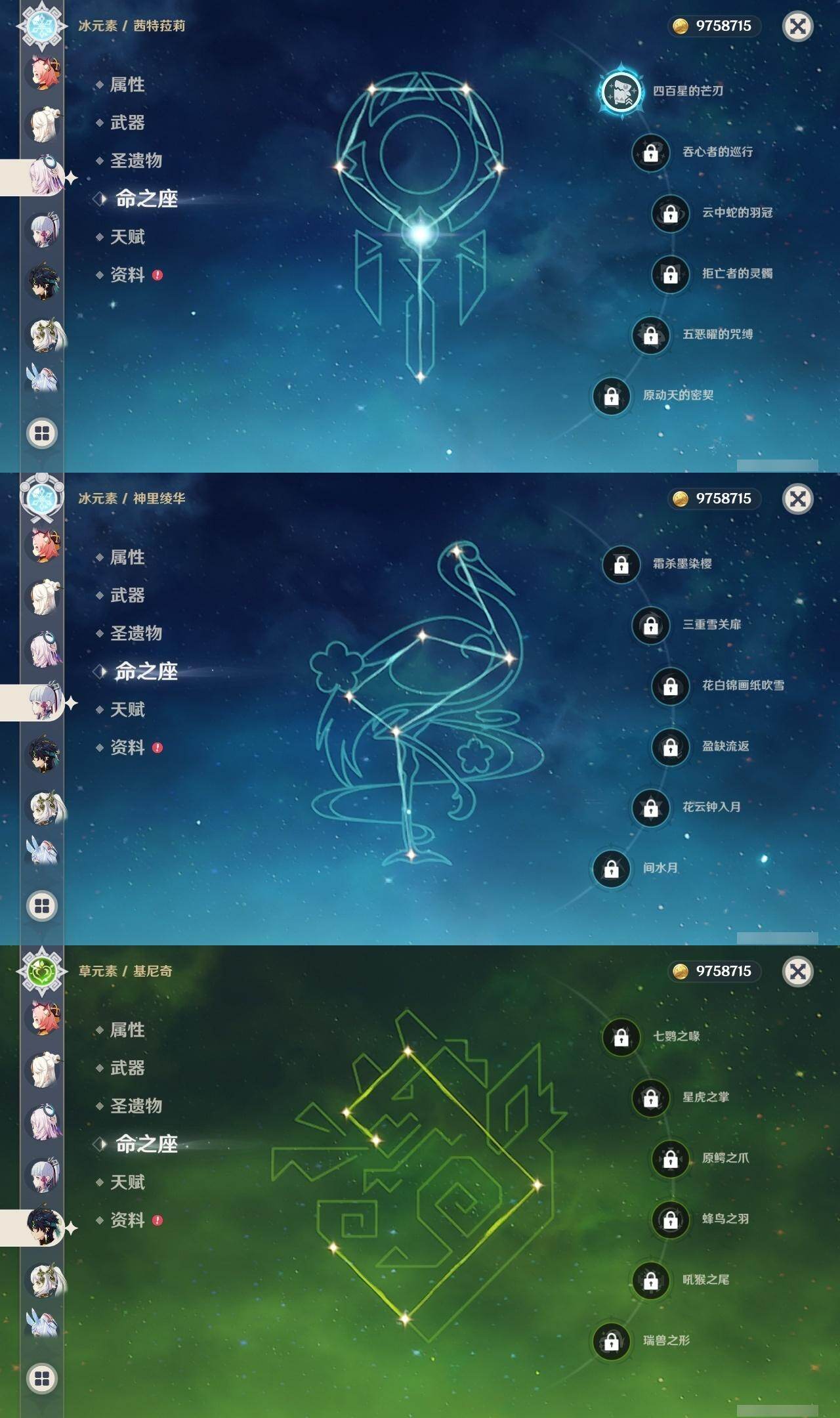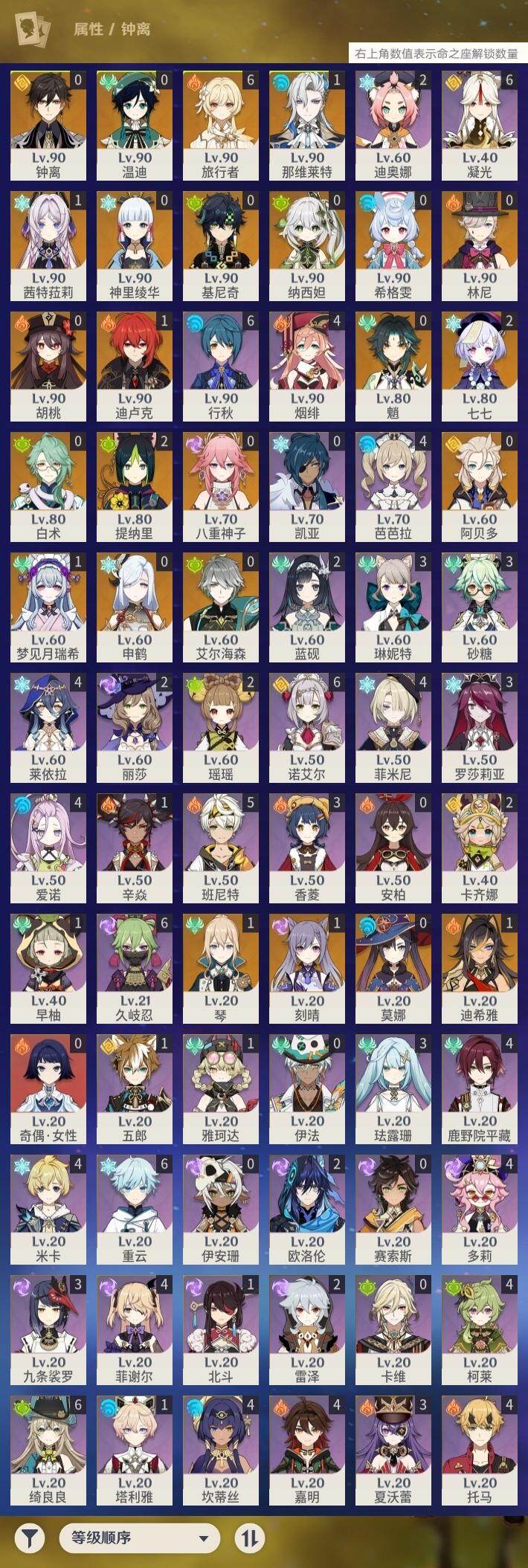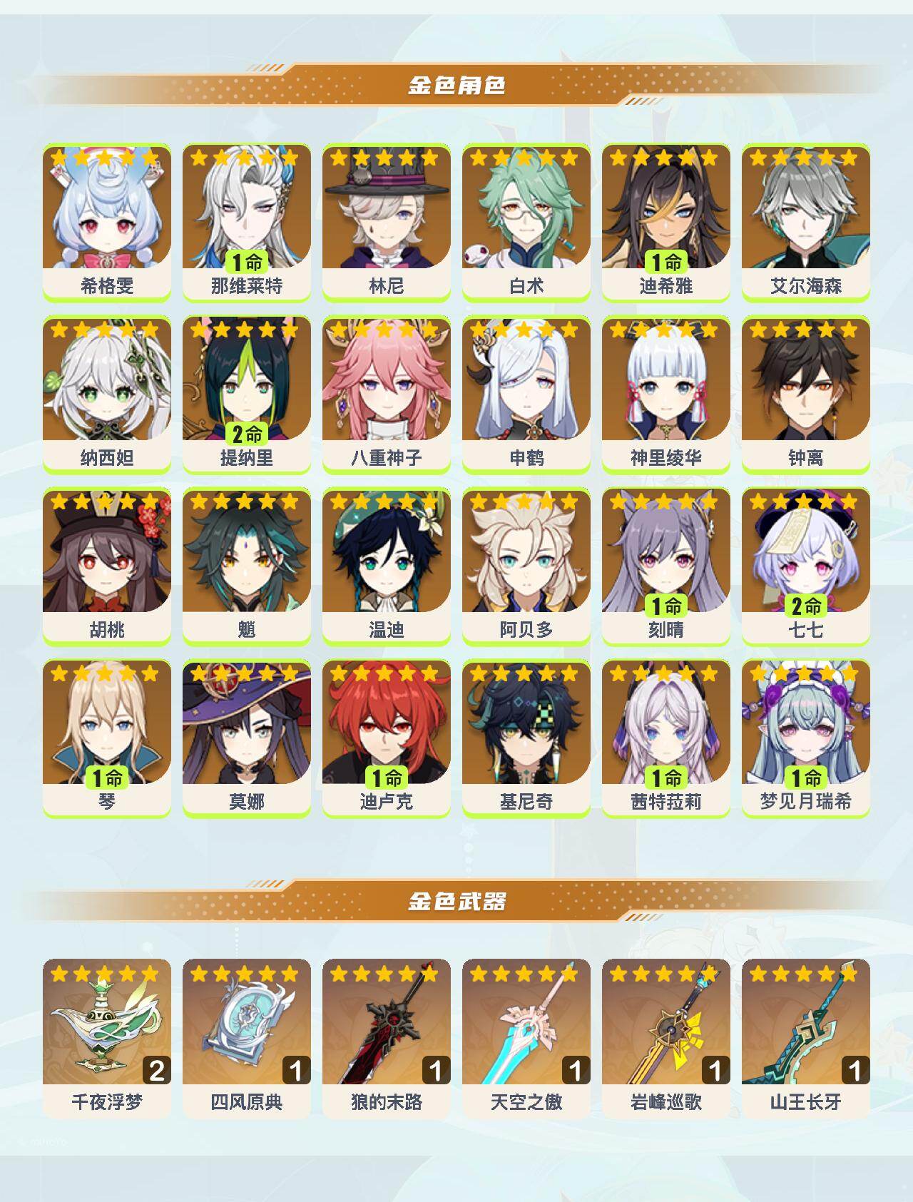 0命希格雯,1命那维莱特,0命林尼,0命白术,1命迪希雅,0命艾尔海森,0命纳西妲,2命提纳里,0命八重神子,0命申鹤,0命神里绫华,0命钟离,0命胡桃,0命魈,0命温迪,0命阿贝多,1命刻晴,2命七七,1命琴,0命莫娜,1命迪卢克,0命基尼奇,1命茜特菈莉,1命梦见月瑞希,精2千夜浮梦,精1四风原典,精1狼的末路,精1天空之傲,精1岩峰巡歌,精1山王长牙