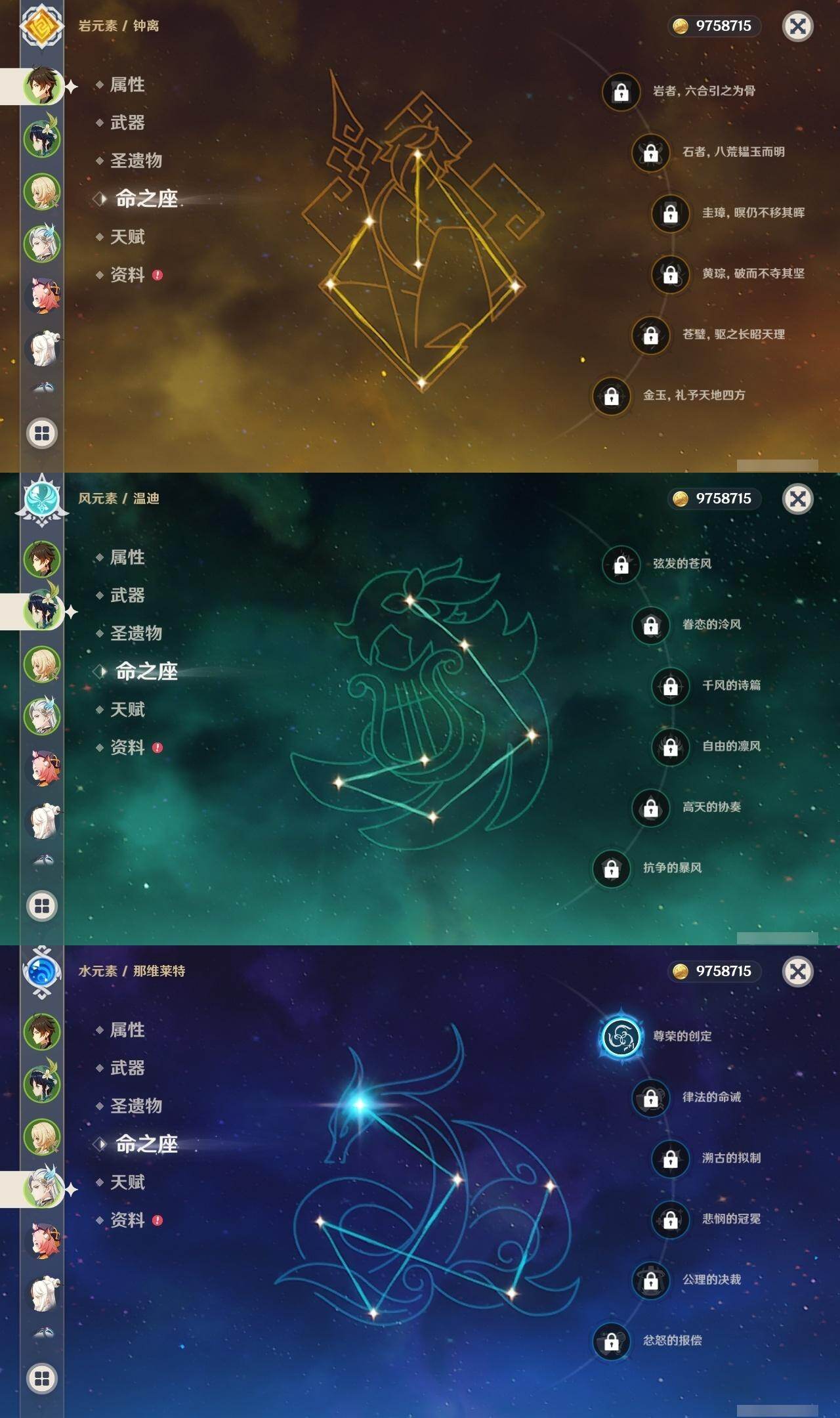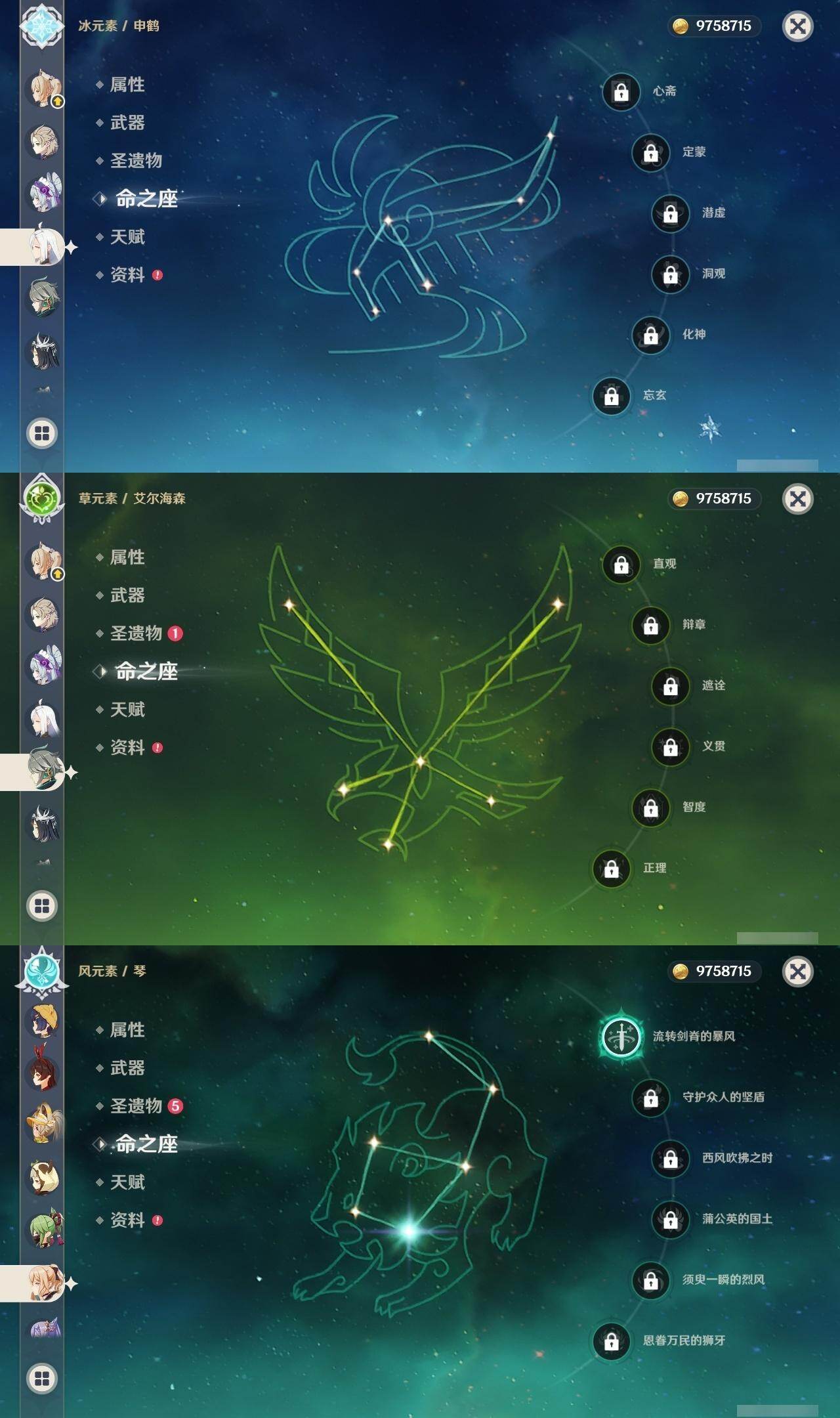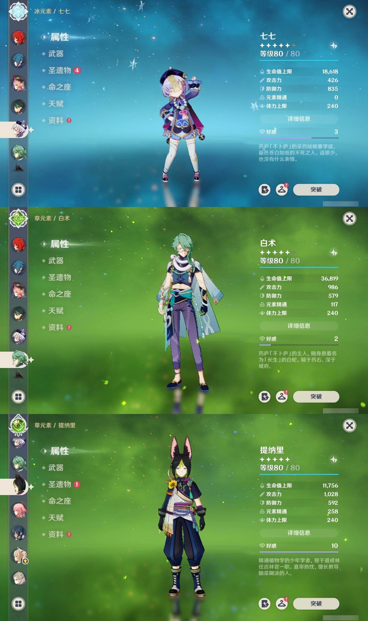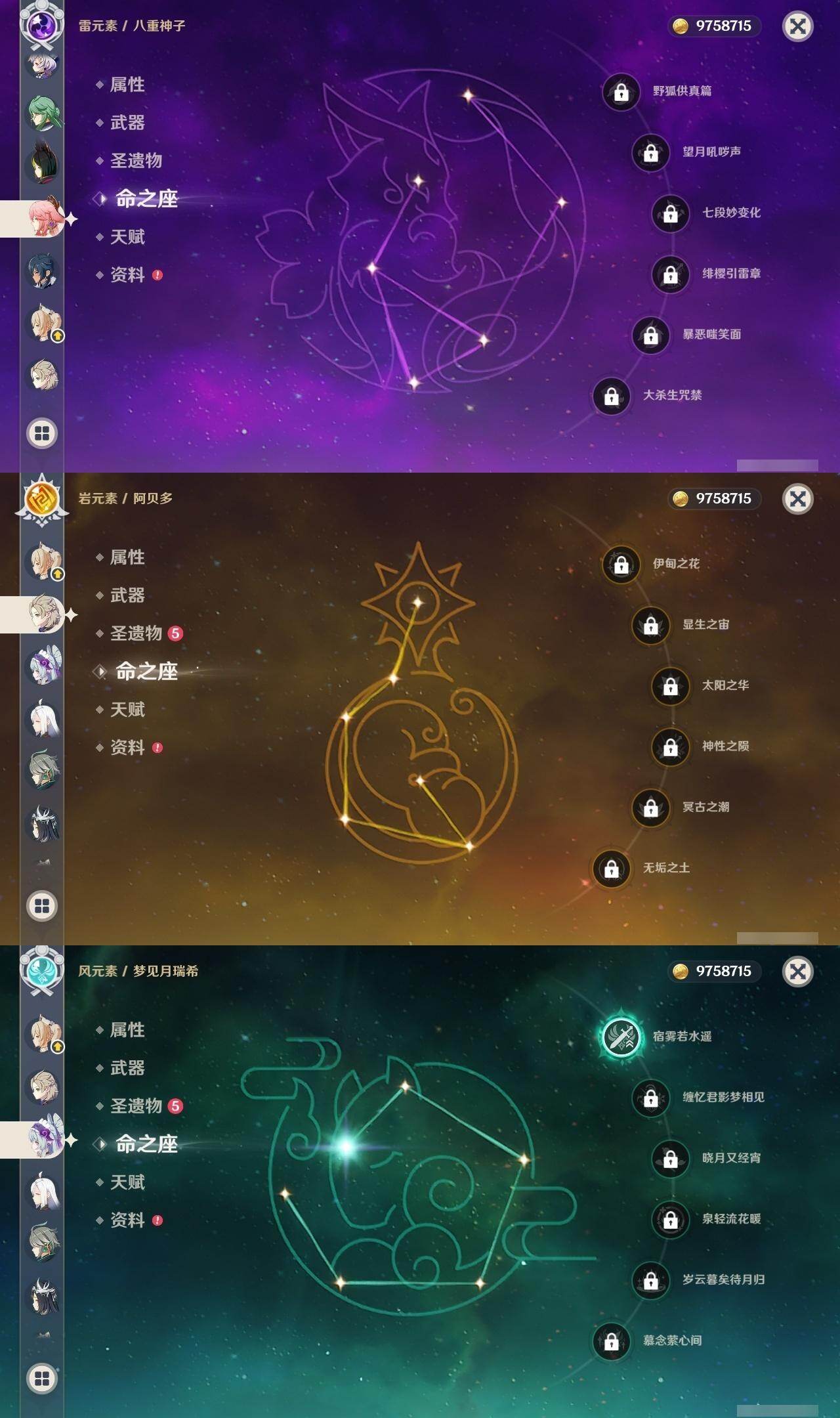 0命希格雯,1命那维莱特,0命林尼,0命白术,1命迪希雅,0命艾尔海森,0命纳西妲,2命提纳里,0命八重神子,0命申鹤,0命神里绫华,0命钟离,0命胡桃,0命魈,0命温迪,0命阿贝多,1命刻晴,2命七七,1命琴,0命莫娜,1命迪卢克,0命基尼奇,1命茜特菈莉,1命梦见月瑞希,精2千夜浮梦,精1四风原典,精1狼的末路,精1天空之傲,精1岩峰巡歌,精1山王长牙