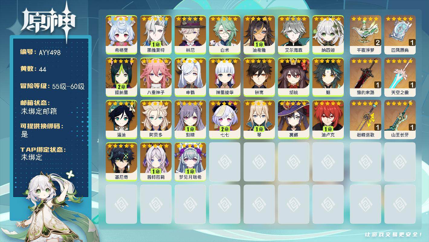 [16593392]58级/44黄/女主/24个五星角色/8个五星武器 0命希格雯,1命那维莱特,0命林尼,0命白术,1命迪希雅,0命艾尔海森,0命纳西妲,2命提纳里,0命八重神子,0命申鹤,0命神里绫华,0命钟离,0命胡桃,0命魈,0命温迪,0命阿贝多,1命刻晴,2命七七,1命琴,0命莫娜,1命迪卢克,0命基尼奇,1命茜特菈莉,1命梦见月瑞希,精2千夜浮梦,精1四风原典,精1狼的末路,精1天空之傲,精1岩峰巡歌,精1山王长牙