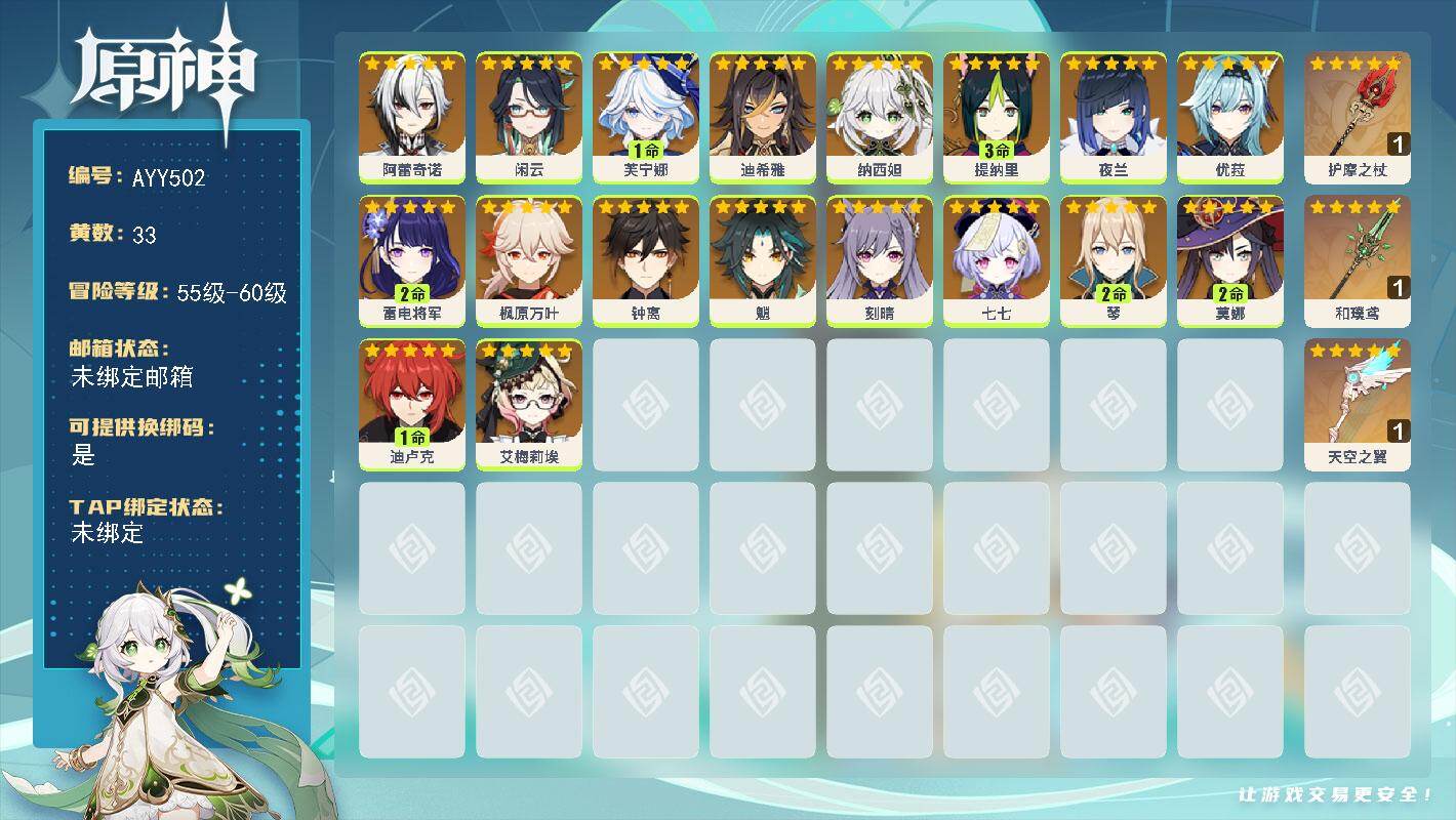[16593437]60级/33黄/男主/18个五星角色/4个五星武器 0命阿蕾奇诺,0命闲云,1命芙宁娜,0命迪希雅,0命纳西妲,3命提纳里,0命夜兰,0命优菈,2命雷电将军,0命枫原万叶,0命钟离,0命魈,0命刻晴,0命七七,2命琴,2命莫娜,1命迪卢克,0命艾梅莉埃,精1护摩之杖,精1和璞鸢,精1天空之翼