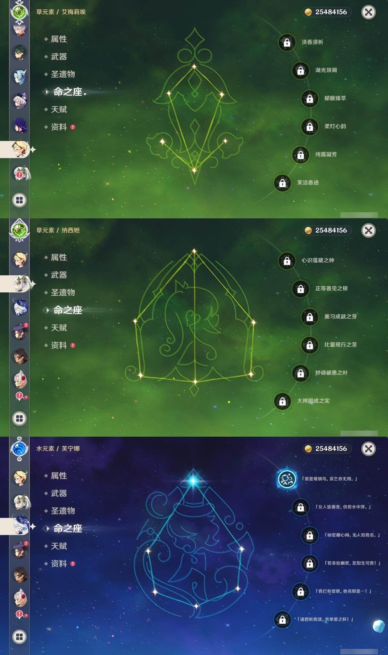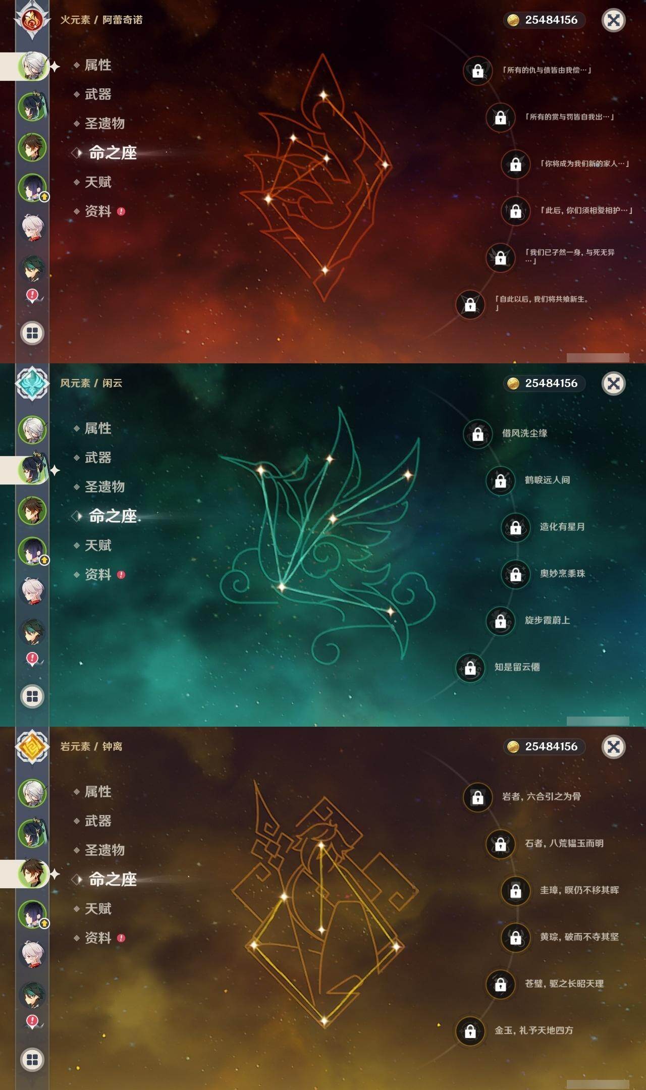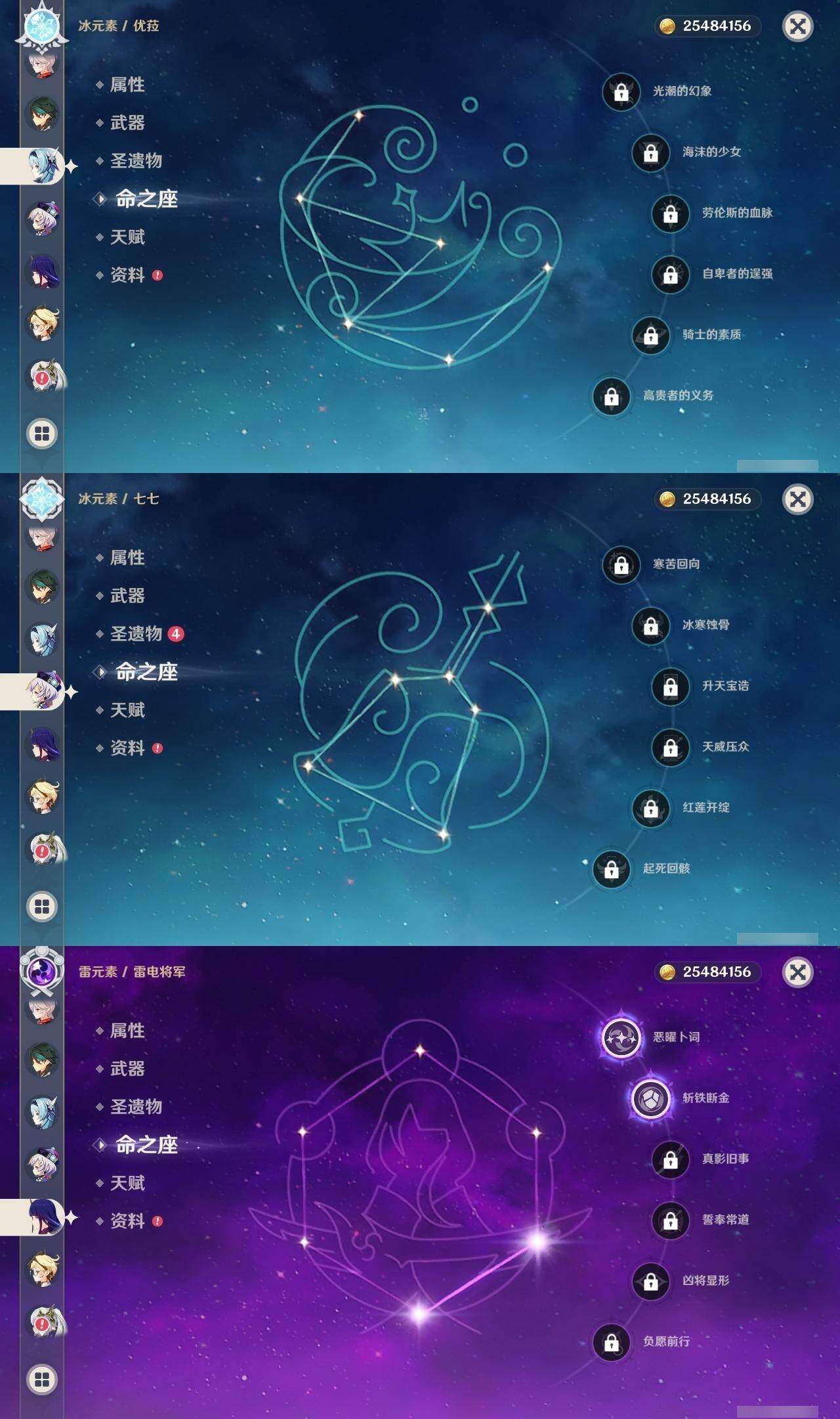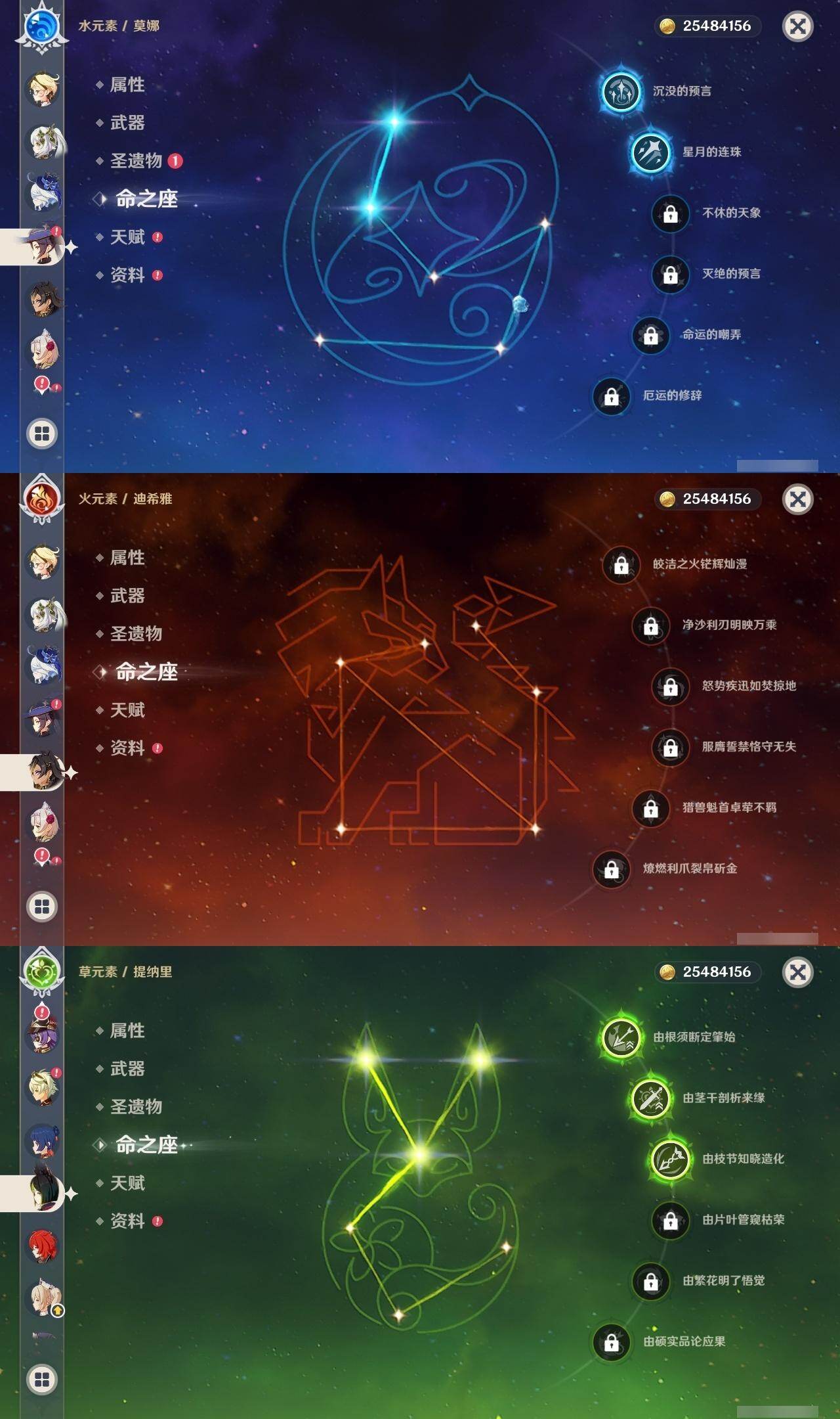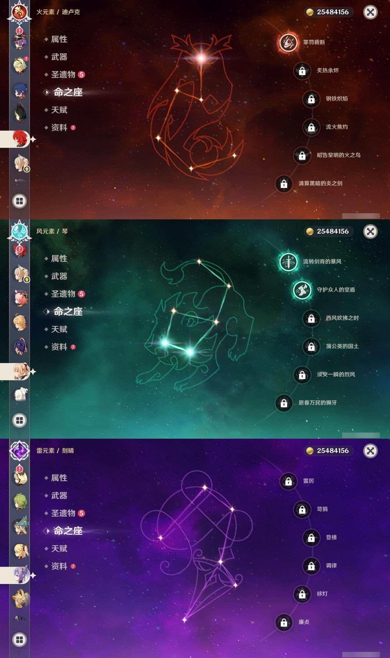 0命阿蕾奇诺,0命闲云,1命芙宁娜,0命迪希雅,0命纳西妲,3命提纳里,0命夜兰,0命优菈,2命雷电将军,0命枫原万叶,0命钟离,0命魈,0命刻晴,0命七七,2命琴,2命莫娜,1命迪卢克,0命艾梅莉埃,精1护摩之杖,精1和璞鸢,精1天空之翼