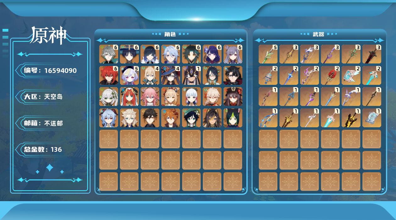 0命闲云,0命莱欧斯利,0命迪希雅,满命艾尔海森,满命流浪者,0命纳西妲,0命妮露,1命赛诺,0命提纳里,满命夜兰,满命神里绫人,0命八重神子,满命雷电将军,0命枫原万叶,0命神里绫华,0命钟离,0命胡桃,0命甘雨,满命魈,0命宵宫,0命温迪,0命达达利亚,0命阿贝多,满命刻晴,5命七七,4命琴,4命莫娜,满命迪卢克,0命伊涅芙,0命哥伦比娅,精1最初的大魔术,精1苇海信标,精5裁叶萃光,精2图莱杜拉的回忆,精3赤沙之杖,精3若水,精2波乱月白经津,精1息灾,精1终末嗟叹之诗,精3薙草之稻光,精2飞雷之弦振,精1雾切之回光,精1苍古自由之誓,精1无工之剑,精2护摩之杖,精1四风原典,精3和璞鸢,精1贯虹之槊,精1阿莫斯之弓,精2天空之刃,精2天空之卷,精1风鹰剑,精3狼的末路,精1天空之傲