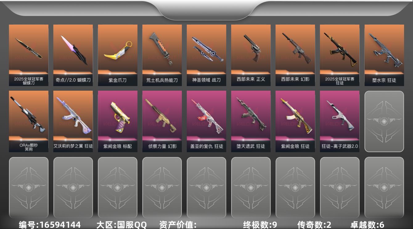 [16594144]【套装】:2025全球冠军赛套装 【英雄】:幻棱,炼狱,维斯,暮蝶,钛狐,壹决,铁臂,捷风,雷兹,幽影,不死鸟,贤者,猎枭,蝰蛇,零,芮娜,奇乐,尚勃勒,霓虹,斯凯,夜露,星礈,K/O,海神,盖可,黑梦,钢锁 【近战武器】:近战武器-2025全球冠军赛 蝴蝶刀,近战武器-奇点//2.0 蝴蝶刀,近战武器-紫金爪刀,近战武器-荒土机兵 热能刀,近战武器-神圣领域 战刀 【狂徒】:狂徒-艾沃莉的梦之翼,狂徒-2025全球冠军赛,狂徒-塑水宗,狂徒-堕天遗武,狂徒-盖亚的复仇,狂徒-紫阙金琅,狂徒-离子武器//2.0,狂徒-荒土机兵 【幻影】:幻影-西部未来,幻影-侦察力量,幻影-神圣领域,幻影-纳米打击,幻影-西部未来 【戍卫】:戍卫-逆冲蛮牛,戍卫-月球哨兵 【獠犬】:獠犬-神圣领域,獠犬-逆冲蛮牛 【冥驹】:冥驹-ORA x 颗秒,冥驹-荒土机兵,冥驹-星云暗涌 【莽侠】:莽侠-月球哨兵 【战神】:战神-神圣领域 【奥丁】:奥丁-纳米打击 【判官】:判官-纳米打击x 【雄鹿】:雄鹿-逆冲蛮牛,雄鹿-月球哨兵 【骇灵】:骇灵-荒土机兵,骇灵-无限竞技,骇灵-星云暗涌 【蜂刺】:蜂刺-星云暗涌 【标配】:标配-紫阙金琅,标配-荒土机兵 【正义】:正义-西部未来,正义-纳米打击,正义-游戏结束,正义-月球哨兵 【鬼魅】:鬼魅-诡秘蛇影,鬼魅-宿怨,鬼魅-星云暗涌 【狂怒】:狂怒-神圣领域,狂怒-逆冲蛮牛 【卡面】:终章:激斗汉堡 卡面,进入射程 卡面,分崩离析 卡面,纳米打击 卡面,抑制技术 卡面,激斗汉堡 卡面,瓦娃脸雪糕 P2 卡面,从黄昏到黎明 卡面,荒土机兵 卡面,银弹猎手 卡面,逆冲蛮牛 卡面,《双城之战》拥抱 卡面,精灵大战 卡面,欢迎来到底城 卡面,南瓜盛典 卡面,正义的化身 卡面,红鳞松叶 卡面,Clutch 卡面,无畏契约GO!第一卷:芮娜 卡面,无畏契约GO!第一卷:零 卡面,《双城之战》金克丝 卡面,别冒尖 卡面,代号红色 卡面,新兵报到 卡面,V契约 卡面,无畏契约 卡面 【喷漆】:小小心意 喷漆,战“素”兔 喷漆,宇宙的指引 喷漆,请求重启 喷漆,逆冲蛮牛 喷漆,纳米打击 喷漆,鼻尖上的蝴蝶 喷漆,简笔画黯兽 喷漆,独守蝰腹 喷漆,他们将落荒而逃 喷漆,通缉:战术企鹅 喷漆,荒土机兵 喷漆,别挡我吃球! 喷漆,嗨宝南瓜灯 喷漆,嘭! 喷漆,都算