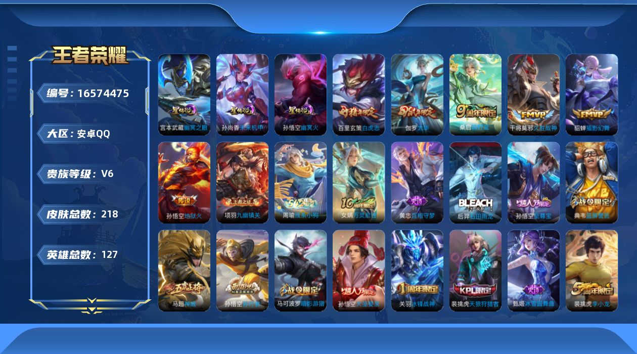 - [11472274]V6 1典藏 2传说 124英雄 214皮肤 可修改实名 荣耀水晶:幻阙歌(貂蝉典藏) 传说皮:炽阳神光 珍宝阁皮:妄想食味,优雅恋人,蔷薇恋人,女武神 限定皮:鸣野蒿,山海·碧波行(瑶年限),遇见飞天,高山流水,五谷丰年,游园惊梦,梁祝,李小龙 史诗皮:星界战将,蒙犽顽岩魄,紫霞仙子,苍穹之光,永昼,江河有灵,蒙恬荣光圣徽,冰冠公主,偶像歌手,晚萤,魅语,电玩·爆裂旋风,暗夜猫娘,末日机甲-吕布,猫狗日记-孙策,猫狗日记-大乔,时之恋人-孙尚香,乱世虎臣,节奏热浪,女仆咖啡,摇滚巨星,水果甜心,绅士熊喵,天才门将,功夫厨神,德古拉伯爵,暗隐猎兽者,幽灵船长,鬼剑武藏,纤云弄巧,繁星吟游(呼啦呼啦),缤纷独角兽,乘风破浪,逐浪之夏,热力回旋,箭羽风息,金属风暴,原初追逐者,圣诞狂欢,圣诞恋歌,鹰眼统帅,魅力维加斯,黎明之约,千筹问战,未来纪元-赵云