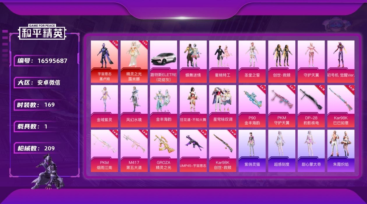 [16595687]安卓 微信-2神装-11粉装-9特效枪-1载具-9粉色飞行器-78969热力值-13王牌印记-169套装-209枪皮