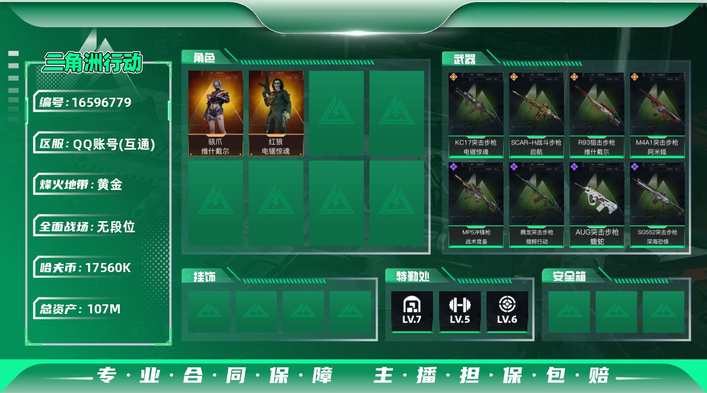 [16596779]可直接换绑 总资产107m 【店主推荐捡漏号!可直接换绑】 17560k哈伏币-107m流动资产-56烽火等级-黄金-1战场等级-无军衔 【干员外观】:骇爪-维什戴尔,红狼-电锯惊魂 【近战皮肤】:近战-黑鹰 【典藏外观】:PKM通用机枪-黑潮,沙漠之鹰-蛇纹涂装 【传说级普通外观】:M4A1突击步枪-阿米娅,SCAR-H战斗步枪-启航,KC17突击步枪-电锯惊魂,R93狙击步枪-维什戴尔 【史诗级普通外观】:AUG突击步枪-蝮蛇,SG552突击步枪-深海恐惧,腾龙突击步枪-猎鳄行动,MP5冲锋枪-战术竞备 【稀有级普通外观】:SCAR-H战斗步枪-荣耀列队,Vector冲锋枪-先锋,SMG-45-行动开启,SMG-45冲锋枪-幻影结构,Mini-14射手步枪-荣耀列队,SR-25射手步枪-开拓 【普通级普通外观】:M4A1突击步枪-粉色涂装,M4A1突击步枪-高雅黑,QBZ95-1突击步枪-高雅黑,QBZ95-1突击步枪-海浪,QBZ95-1突击步枪-海色,K416突击步枪-高雅黑,AUG突击步枪-浅蓝涂装,SG552突击步枪-浅蓝涂装,SG552突击步枪-海浪,SCAR-H战斗步枪-数码迷彩,G3战斗步枪-高雅黑,MP5冲锋枪-海色,MP5冲锋枪-黄蜂,Vector冲锋枪-几何迷彩,UZI冲锋枪-海色,M1014霰弹枪-高雅黑,M1014霰弹枪-海浪,M249轻机枪-黄蜂,SKS射手步枪-三角洲力量,SR-25射手步枪-黄蜂,沙漠之鹰-海浪 【军牌】:军牌-装备修理,军牌-享受音乐,军牌-修整,军牌-信誉优秀 【挂饰】:挂饰-维什戴尔,挂饰-诡影狙击兵,挂饰-诡影喷火兵,挂饰-暗行哨兵,挂饰-启程,挂饰-阿萨拉徽章