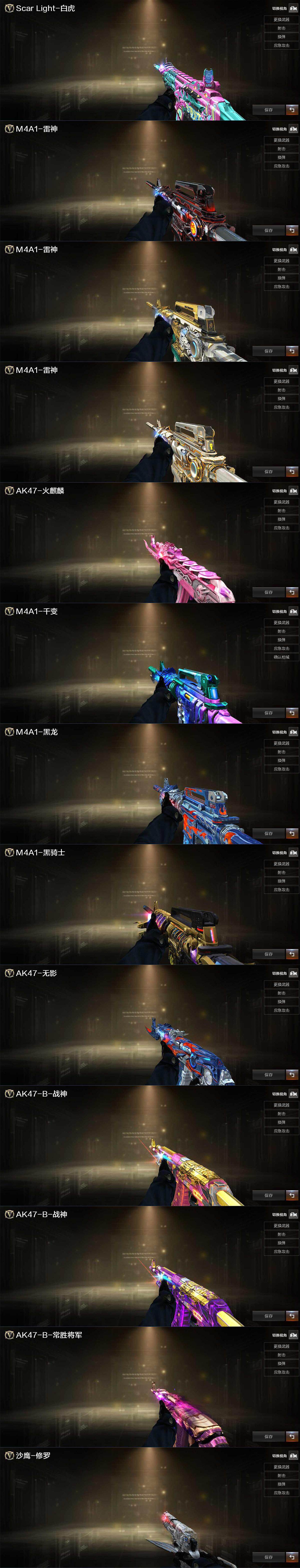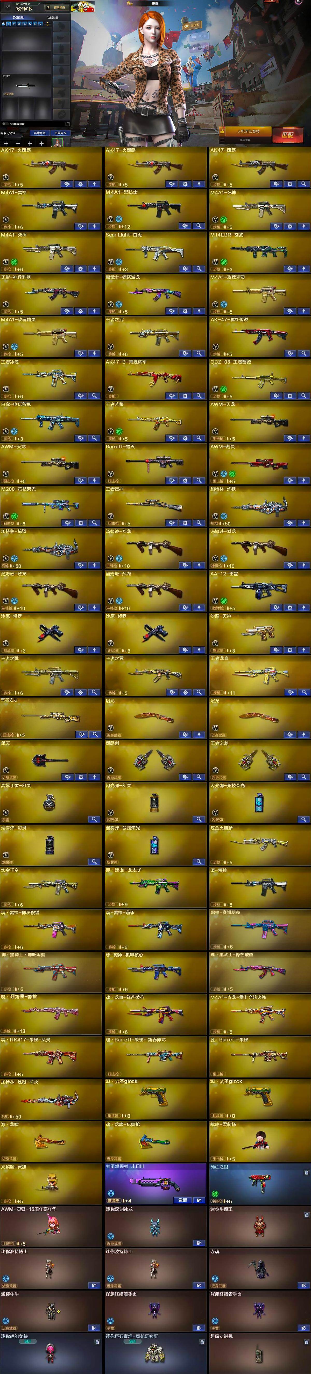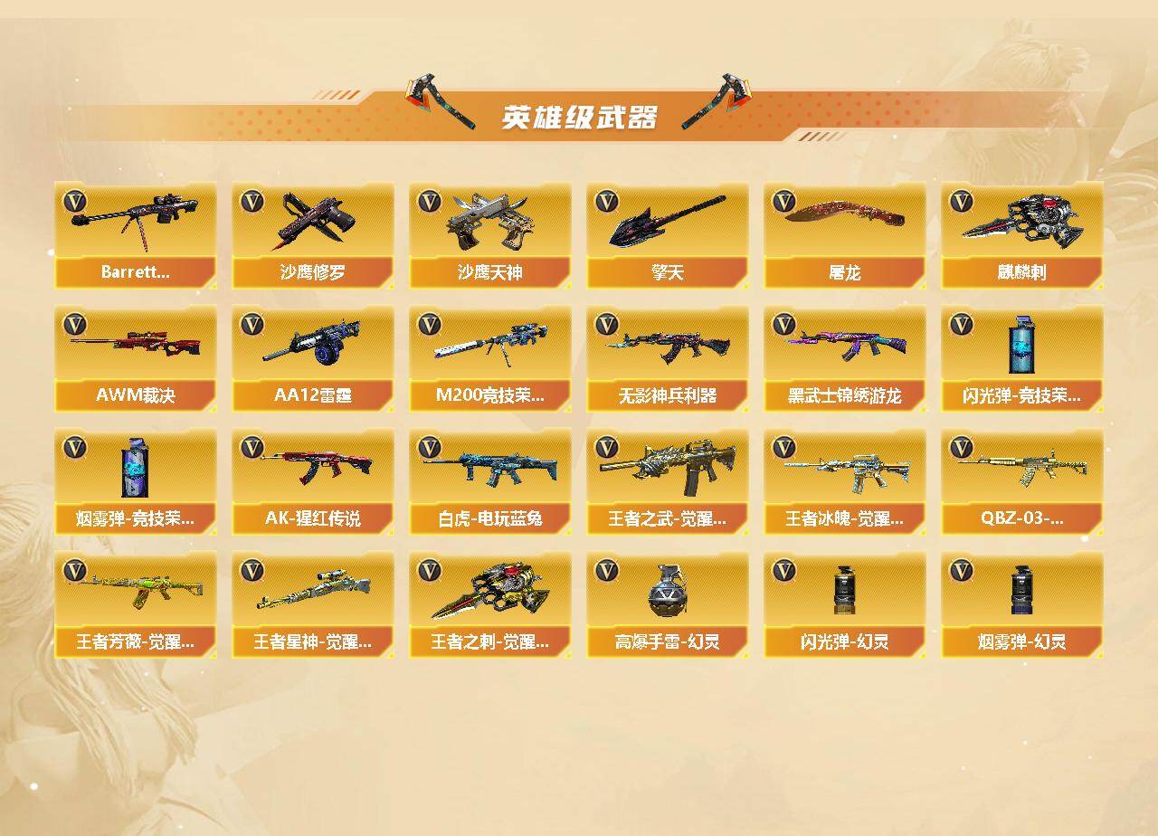 【英雄级武器】:AK47-火麒麟*2,AK47-麒麟,M4A1-雷神,M4A1-黑骑士,M4A1-死神*2,Scar Light-白虎,M14EBR-玄武,无影-神兵利器,黑武士-锦绣游龙,M4A1-玫瑰精灵*2,王者之武-觉醒版,AK-47-猩红传说,王者冰魄-觉醒版,AK47-B-常胜将军,QBZ-03-王者蔷薇-觉醒版,白虎-电玩蓝兔,王者芳薇-觉醒版,AWM-天龙*2,Barrett-毁灭,AWM-裁决,M200-竞技荣光,王者星神-觉醒版,加特林-炼狱*2,汤姆逊-烈龙*4,AA-12-雷霆,沙鹰-修罗*2,沙鹰-天神,屠龙*2,擎天,麒麟刺,王者之刺-觉醒版,高爆手雷-幻灵,闪光弹-幻灵,闪光弹-竞技荣光,烟雾弹-幻灵,烟雾弹-竞技荣光